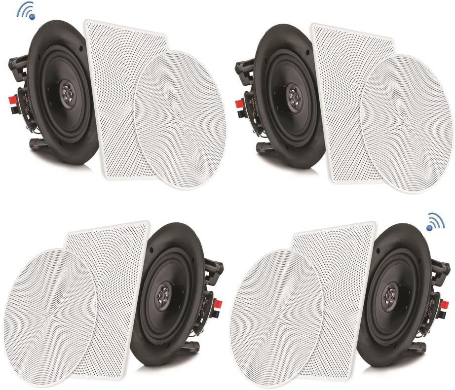 Pyle 8” 4 Bluetooth Flush Mount In-wall In-ceiling 2-Way Speaker System Quick Connections Changeable Round/Square Grill Polypropylene Cone & Tweeter Stereo Sound 4 Ch Amplifier 250 Watt (PDICBT286)Features:Includes (4) 8.0’’ -inch SpeakersIn-Wall / In-Ceiling SystemBluetooth for Wireless Music Streaming Ability2-Way Stereo Sound4-Channel Digital Amplifier1/2’’ High Compliance Polymer TweeterQuick Connect Spring-Loaded Speaker TerminalsPolypropylene Cone with Rubber EdgeMounts Flush to Walls or CeilingsIncludes Changeable Round & Square Speaker GrillsCut-Out Size Template for Easy InstallationMounts Flush on Walls or CeilingsEcologically Friendly ABS ConstructionPerfect for Custom Installations & ApplicationsBluetooth Connectivity:Includes Bluetooth Wireless Audio Control ReceiverWorks with All of Today’s Latest Devices (Smartphone, Tablet, Laptop, Computer, etc.)Bluetooth Network Name: ‘Pyle’Bluetooth Network Password: ‘0000’ (4 Zeroes)Bluetooth Version: 4.0Wireless Range: 30’+ ft. What’s in the Box:(4) 8’’ Speakers(4) Removable Round Speaker Grills(4) Removable Square Speaker GrillsSpeaker Connection WireBluetooth Control ReceiverPower SupplyTechnical Specs:MAX Power Output: 250 WattImpedance: 8 OhmSensitivity: 89 dBFrequency Response: 40Hz-20kHzPower: 100/240V (12V DC Power Supply)Total Unit Dimensions (Diameter x Depth): 11.2’’ x 3.9’’Cutout Diameter: 9.4’’, Cutout Mounting Depth: 3.5’’Single Speaker Weight: 5.12 lbs.The Pyle In-Wall/Ceiling Bluetooth Speaker Kit delivers effortless stereo sound to any room in your home or office. The included Bluetooth controller allows for wireless music streaming ability and doubles as a sound processing digital amplifier. You will be able to stream audio from all of your favorite devices (like smartphones, tablets and computers). Each speaker features a high-compliance polymer tweeter that delivers full, rich sound without cluttering floor space. They are made of Ecologically friendly ABS material and include changeable round and square grills. Spring-loaded speaker terminals make for quick connection and the system comes with a cut-out template for easy installation. Mount them in a convenient location on the wall or ceiling for a flush, clean look. Achieve wide-range sound performance and add audio to any room with the Pyle In-Wall/Ceiling Bluetooth Speaker Kit.Pyle Bluetooth Receiver Wall Mount - In-Wall Audio Control Receiver w/ Dual USB Charging Port, 3.5mm AUX Input for Sound Systems - For Home Theater Entertainment - Includes DC Power Adaptor - PWPBT67p>The Pyle PWPBT67 Audio Receiver Wall Plate adds convenient Bluetooth audio streaming and control where you need it. Mount the system in-wall for instant wireless music streaming with the ability to connect to your home theater. Quick and easy installation fits into standard size electrical/gang boxes and can be installed in virtually any wall at home or in the office. Wall plate features include rotary volume control knob with touch button controls, AUX (3.5mm) audio input for connecting external devices, RCA (L/R) outputs for amplified system connection and dual USB device charging ports. The audio receiver includes a power supply adapter along with integrated RJ-45/Network Ethernet jacks for optional system connection. Enjoy versatile and wireless audio control with the Pyle PWPBT67 Bluetooth In-Wall Audio Control System. Features:In-Wall, Wall Plate Audio/Music ControlUniversal Standard Wall Plate SizeFits U.S. Electrical Gang BoxesAux (3.5mm) Audio Input Connector JackIncludes DC Power Adaptor*Decorative Wall Plate Frame Cover Not Included Technical Specs:Bluetooth Version 4.0, A2DPBluetooth Wireless Range: Up to 50' Feet(2) USB DC 5V PortsDC 15V Power Connector*Optional Audio Connection via RJ45 Cable
