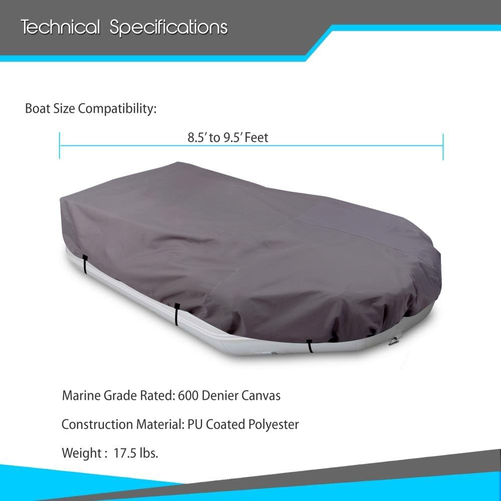 Pyle Model : PCVFLT13Marine Boat Cover for Inflatable BoatsArmor Shield Inflatable Boat Cover - Universal Cover for Inflatable Boats (8.5’ - 9.5’ ft.)Features:Universal Boat Cover DesignWorks with Inflatable Boats, Rigid Inflatable Boats (RIBs), Dinghy (Dingey) BoatsRugged & Heavy-Duty Design for Safe StorageElastic Cord All Round for Tight Custom FitWaterproof & Weather-ResistantQuick Release Buckle FasteningMarine Grade Polyester Fabric, 600DProtects Against Sun DamageDouble Stitched Seams for DurabilityWhat’s in the Box:Inflatable Boat CoverStorage / Travel BagTechnical Specifications:Boat Size Compatibility: 8.5’ to 9.5’ Feet (Total Length)Marine Grade Rated: 600 Denier CanvasConstruction Material: PU Coated PolyesterThe Pyle Armor Shield Inflatable Boat Cover - Universal Cover for Inflatable Boats (8.5’ - 9.5’ ft.) - Universal Boat Cover Design - Works with Inflatable Boats, Rigid Inflatable Boats (RIBs), Dinghy (Dingey) Boats - Rugged & Heavy-Duty Design for Safe Storage - Elastic Cord All Round for Tight Custom Fit - Waterproof & Weather-Resistant - Quick Release Buckle Fastening - Marine Grade Polyester Fabric, 600D - Protects Against Sun Damage - Double Stitched Seams for Durability - What’s in the Box: - Inflatable Boat Cover - Storage / Travel Bag - Technical Specifications: - Boat Size Compatibility: 8.5’ to 9.5’ Feet (Total Length) - Marine Grade Rated: 600 Denier Canvas - Construction Material: PU Coated Polyester.