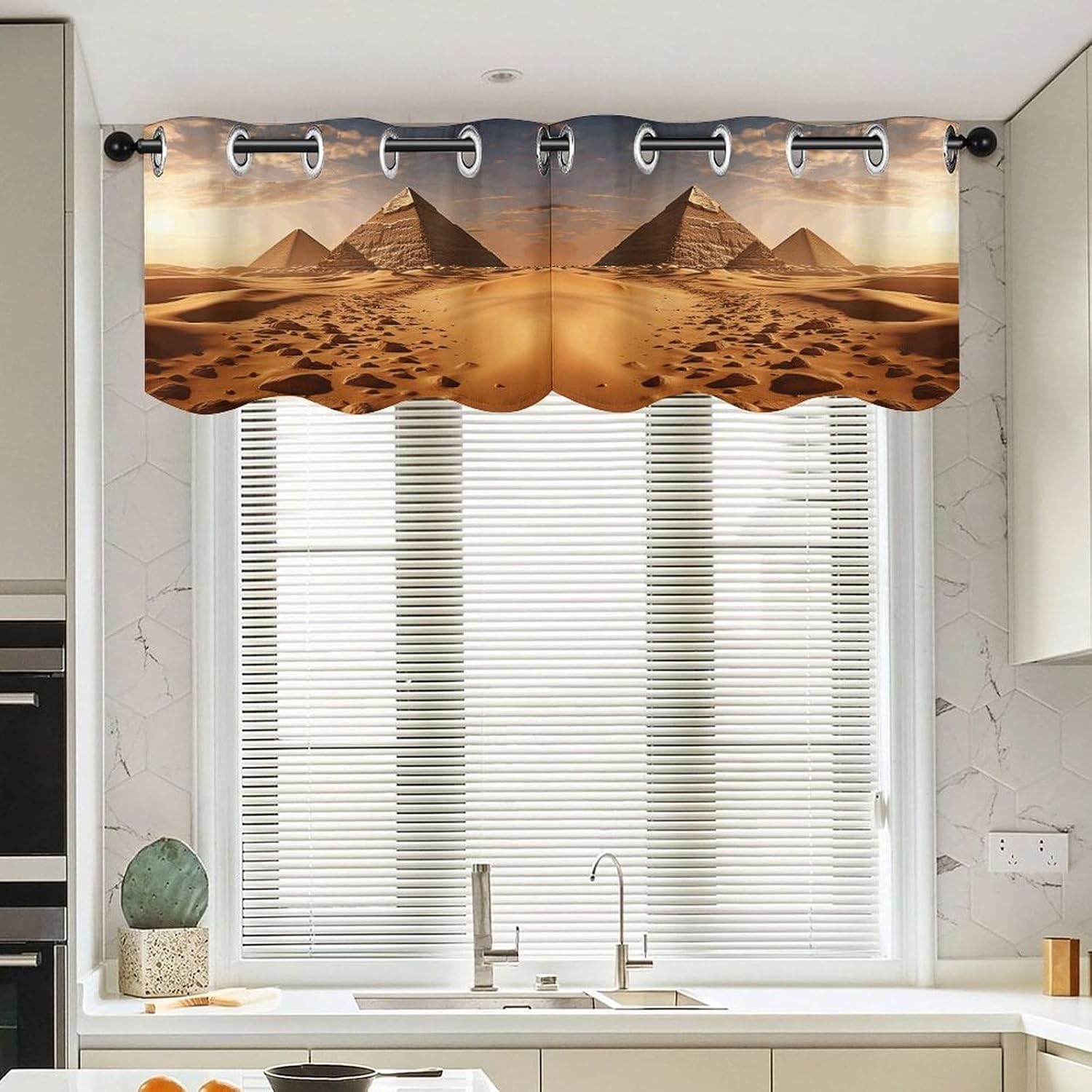 Perfect Pair Printed Curtain - Pyramid Africa Desert Light Filtering Modern Window Décor Elevate your windows with our beautifully designed two-piece Pyramid Africa Desert curtain set, combining a functional printed curtain with an elegant coordinating valance. Crafted for versatility, this Pyramid Africa DesertCurtain is the ideal solution for adding privacy, style, and controlled light to any room. Premium Fabric & Modern Design: Crafted from premium fabric, this Pyramid Africa Desert Curtain maintains a soft hand-feel and a graceful drape over time. The elegant print and smooth texture provide a sophisticated look that enhances your home's ambiance. Optimal Light Filtering & Protection: This Pyramid Africa Desert modern curtain effectively filters harsh sunlight, creating a softly illuminated and comfortable atmosphere. It helps protect your furniture and flooring from UV damage while providing a good level of privacy. The fabric is resilient and designed for easy care. Versatile Application: This Pyramid Africa Desert ready-to-hang Curtain is designed for broad compatibility. The curtain features standard 4.5cm grommets for smooth gliding on most curtain rods. With dimensions of 52" W x 18.1" H per panel, it's perfectly suited for various window styles. Ideal as a charming kitchen curtain or cafe curtain for bottom-up coverage, it also functions perfectly as a tier curtain. Whether you're looking for a stylish printed curtain for your living space, a functional light filtering curtain for a bedroom, or a complete look with a curtain valance, this Pyramid Africa Desert set delivers both style and purpose. Set Includes: Two printed curtain panels Bring a cohesive and stylish upgrade to your home with this Pyramid Africa Desert versatile curtain .