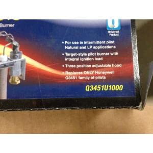The Q3451 Intermittent Pilot Burners provide pilot flame ignition and sensing for intermittent ignition systems. They consist of a pilot burner with a single rod combination spark igniter/flame sensor, orifice assembly, and compression fitting. Features Single-rod Pilot Burner/Igniter Sensors have an integral cable and bent rod that sparks to hood. Application: Universal Pilot Burner for Intermittent Pilot Applications Includes: BCR-20, BCR-18, BBR-12, BBR-11, BCR-10 orifices, Adjustable tip style, Universal mounting bracket , 36 in. and 55 in. igniter lead lengths Used With: S8600F, S8600H, S8600M, S8610F, S8610H, S8610M, S8610U, S8660D, S8660E, S8670D, S8670E