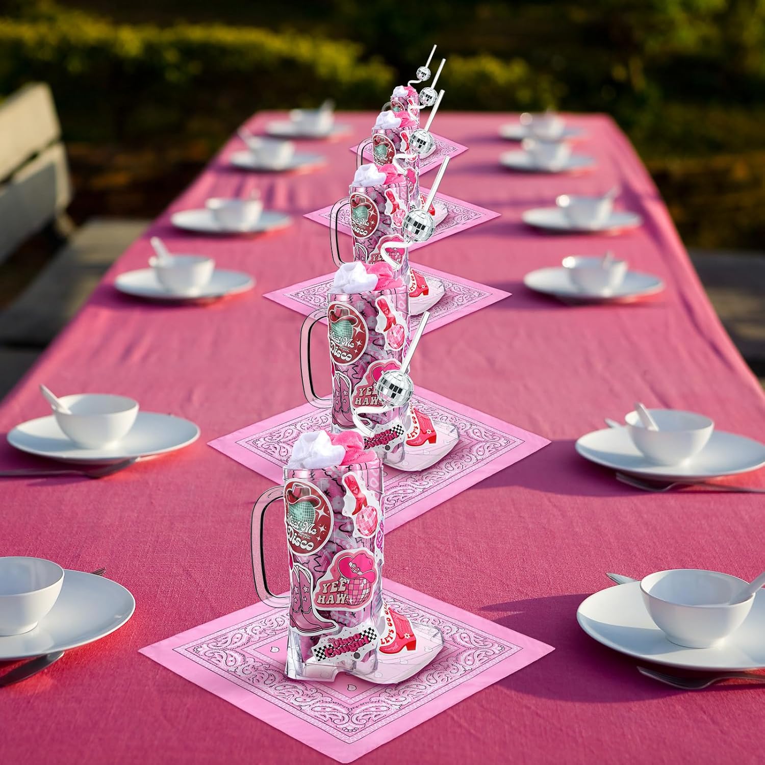| Included Components | 6 x Cowboy boot cups ,6 x Disco ball straws ,6 x Cowboy bandanas ,12 x Satin hair scrunchies ,1 Set of 55 pcs cowgirl stickers |