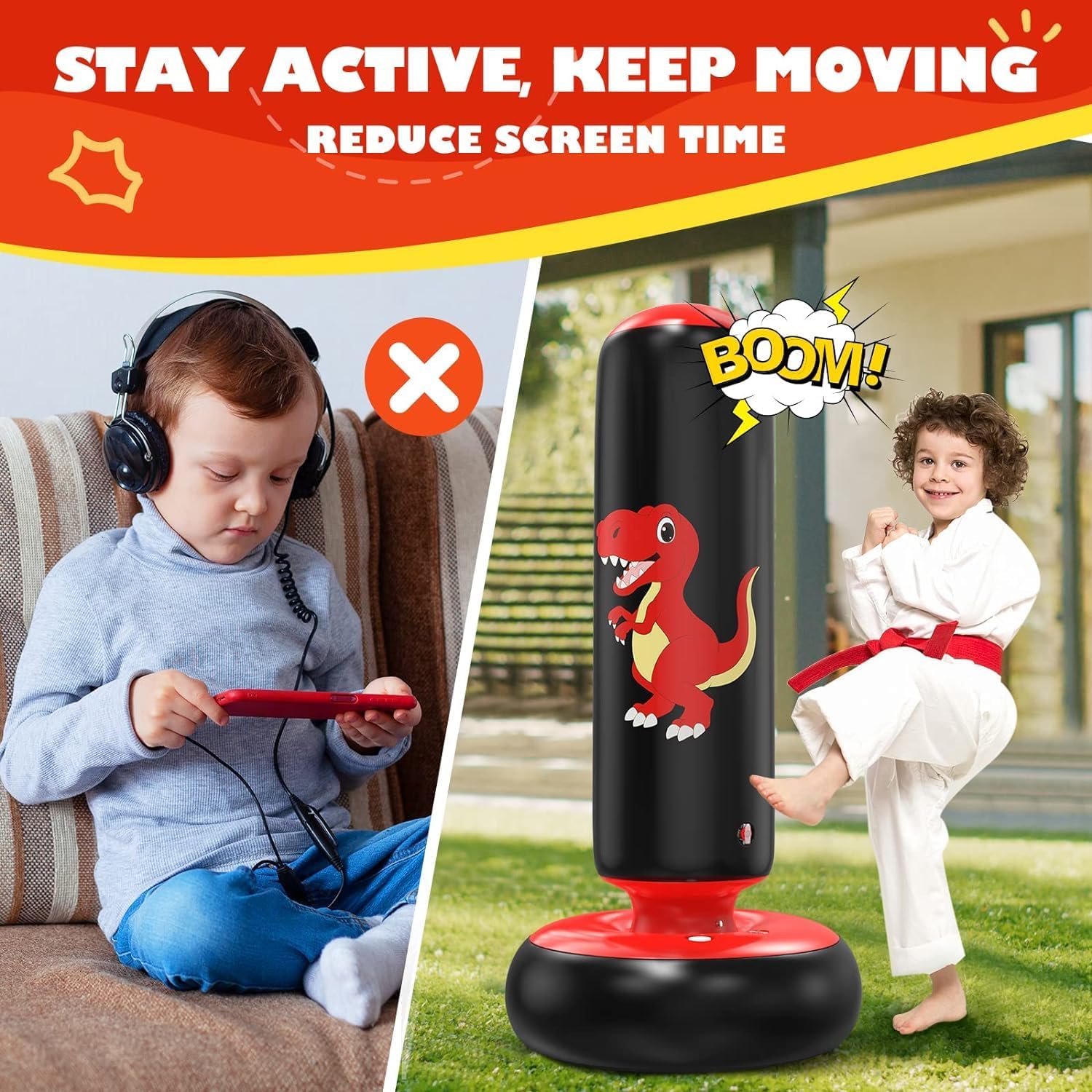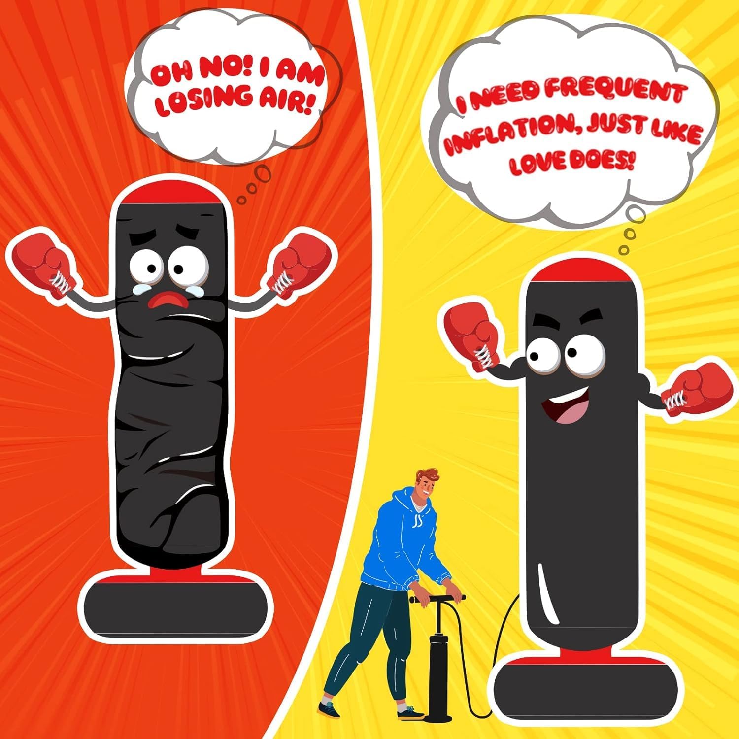 Are your little ones full of energy and looking for a fun way to channel it? Look no further! Introducing QPAU Inflatable Punching Bag from Fight for Love boxing series for kids to live an active and entertained childhood to protect their family. This colorful karate punching bag sizes is 48 inches for kids aged 3 to 8. It's a great size for practicing boxing skills and spend fun time with family. At QPAU we value the safety of the children. This durable blow up punching bag is made from non-toxic PVC material, ensuring hours of safe and energetic play for your little champions. To ensure the stability when playing fill the base with water to keep it firmly in place, even during the most enthusiastic punches! With each QPAU kids punching bag, you get a pair of FREE boxing gloves, specially sized for small hands. It's perfect for indoor playrooms or even outdoor spaces. Your kids will feel like real boxing champions! QPAU Inflatable Standing Punching Bag for Kids is the ultimate accessory for active playtime and teaching your kids to “Fight for Love”.