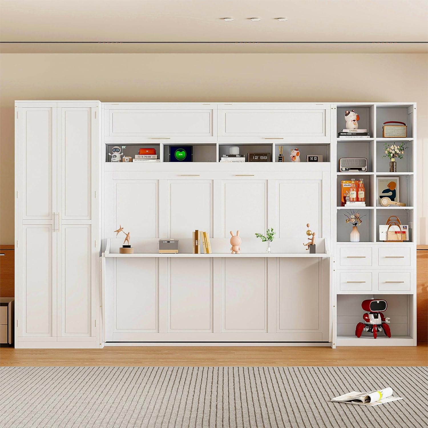 Transform cramped rooms into versatile living areas! This queen-sized Murphy bed combines a fold-up mattress frame with a full cabinet, spacious desk, and a flip-up vanity featuring a mirror. Perfect for apartments, studios, or guest rooms, it eliminates clutter while providing dedicated zones for sleeping, working, and groomingSpecificationsProduct Type: Murphy BedSize: QueenColor: White/EspressoMaterial: Plywood + MDF + PinewoodAssembly Required: YesCountry of Origin: VietnamNotes: Manual measurement has been used, there may be some reasonable error. All the pictures are taken by actual samples, slight chromatic aberration may occur due to lighting or display.Weight & DimensionsOverall Product Dimension: 126.2" L x 86.9" W x 88.2" HNumber of Package: 3Weight Capacity: 400 lbsRecommended age: 6+Recommended Mattress Thickness: 8"