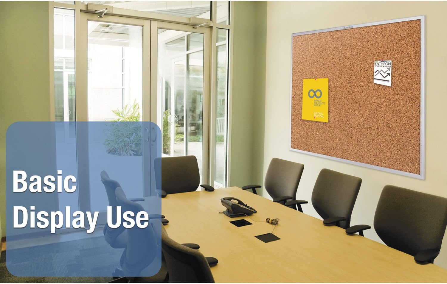 Product Description Durable 36" x 24" natural-cork bulletin board with heavy-gauge aluminum frame secures documents with push pins. Delivers effective performance when communication is needed in low-use break rooms or on factory floors. Self-healing surface. Easily secure to wall with heavy-duty, factory-installed mounting system. Heavy-gauge anodized aluminum construction with satin finish frame complements any interior. Available in other sizes. From the Manufacturer Quartet Cork Bulletin Board, Aluminum Finish Frame, Multiple Sizes Available Display photos or quickly and easily leave reminders for yourself and others. Ideal for communication and display Featuring a sleek aluminum finish frame, these boards blend in well with modern décor. Cork bulletin boards have long been a standard in classrooms and office spaces, but they are just as useful for personal needs as they are for large groups. Featuring a sleek aluminum finish frame, these boards blend in well with modern décor. The cork surface provides a platform that can be used for just about any communication or display need. Tack up photos, leave notes for yourself, friends or family, and keep important information in easy view. A cork board also provides a convenient place to store smaller items that could get lost in a drawer, such as concert tickets or event invitations. The cork board surface is natural and fully tackable; items are easily held in place with just a few push pins. For better durability, these bulletin boards also feature self-healing cork. A unique feature, self-healing cork closes over the holes created by push pins to resist crumbling even after years of use. Available in a number of different sizes, you can select the cork bulletin board that best fits the space in your home, office or dorm room. The factory installed mounting system ensures that boards can be securely hung from the wall with ease.A cork bulletin board with a cool aluminum frame fits in well at home, school or the office. Display photos, tack up frequently referenced documents, or quickly and easily leave reminders for yourself and others. Choose the size that best fits your needs. Choose the Quartet Cork Product That's Right for YouQuartet offers a variety of durable cork products that can be used as surfaces for display, or for arts and crafts needs.Cork Tiles--All natural cork material is both durable and tackable. Secure items to these customizable frameless and modular cork tiles using push pins. Each tile is 1/4" thick, measures 12" x 12" and can be used alone or with others for a variety of needs. Adhesive self-stick tape included for mounting.Cork Bulletin Boards--Choose either an oak or aluminum finish frame cork bulletin board. Ideal for light to moderate display use, the tackable cork holds pinned documents in place. The natural, self-healing feature of the cork extends the surface life of the board. Mounting hardware included. Multiple sizes available.