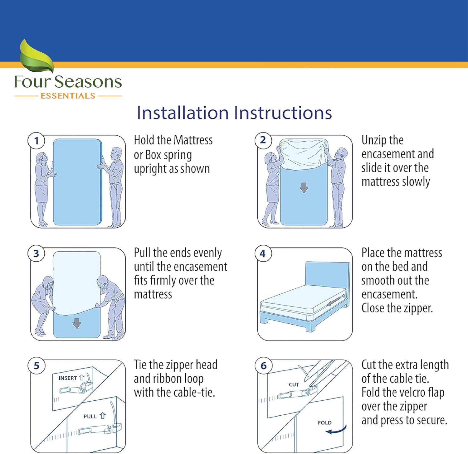 Premium Quality Queen Size Mattress Encasement by Four Seasons Essentials Keep your mattress fresh and well-protected with this durable six-sided zippered cover. Designed for everyday comfort and long-lasting use, this encasement combines a secure fit with reliable protection. Six-Sided Zippered Design – Fully encases your mattress for all-around coverage.Stretch Fit – Flexible fabric accommodates Queen mattresses 12–16 inches deep.Soft & Breathable – Smooth material stays noiseless and comfortable under sheets.Waterproof Barrier – Inner layer helps block spills, perspiration, and everyday messes.Easy Care – Machine washable and simple to remove for quick cleaning.Quality Materials – Top surface: 100% polyester. Inner backing: 100% polyurethane. Simple Installation A full-length zipper makes it easy to place your mattress inside the cover. Just unzip, slide in your mattress, then zip closed for a secure fit. Zipper Seal with Velcro Cover Features a Velcro flap and tie-down design to help keep the zipper in place and provide extra protection once sealed. Reinforced Zipper Lining Includes a 3” secondary polyester lining that wraps around the zipper section for added durability and coverage. Care Instructions: - Machine wash warm; rinse cold. Wash separately for best results. After washing, flip inside out and run an extra spin cycle. - Tumble dry low or line dry. For faster drying, add 1–2 large dry towels.