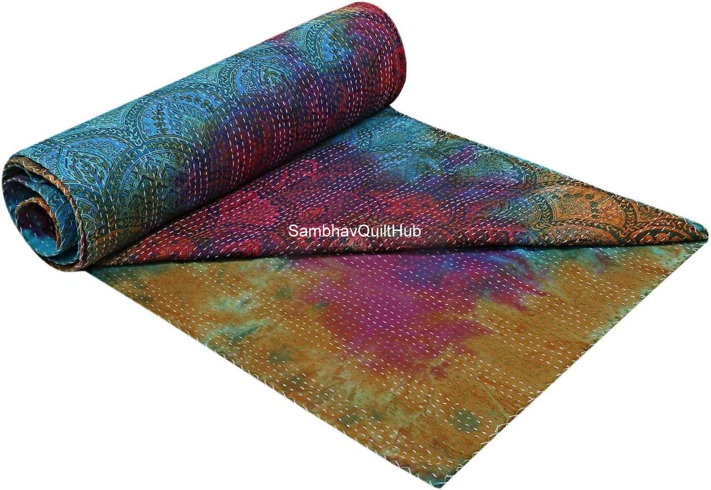 Made with 100% cotton and natural vegetable colors. This piece is of art is completely hand stitched by Women artisan in Rajasthan, India. It can make any room alive with its vivid colors, stunning Floral Floral print and embroidery, made using traditional and famous kantha hand embroidery method. Made from two thin layer of cotton fabric make this piece of art irresistible and also very comfortable. Adding to it's style, this kantha quilt is reversible and both sides can be used. Kantha is still the most popular form of embroidery practiced by rural women.typically use old saris and cloth and layer them with kantha stitch to make a light blanket, throw or bedspread. These cotton lightweight "Quilts" with a beautiful and colorful Paisley design can be used as 1. Bedspread , Bedding Throw , Blanket Or Quilt 2. A Summer Bed Cover 3. A Throw 4. A Fabulous Picnic Rug 5. Nice Bedroom Quilt , This can fit to a 90 x 108/60*90/108X108 inch's wide King/Twin size bed as blanket or throw or can easily fit as bedspread / bed cover to King/Twin bed .Size Twin (60X90), Queen Size (90X108 inch), King Size (108X108) inch