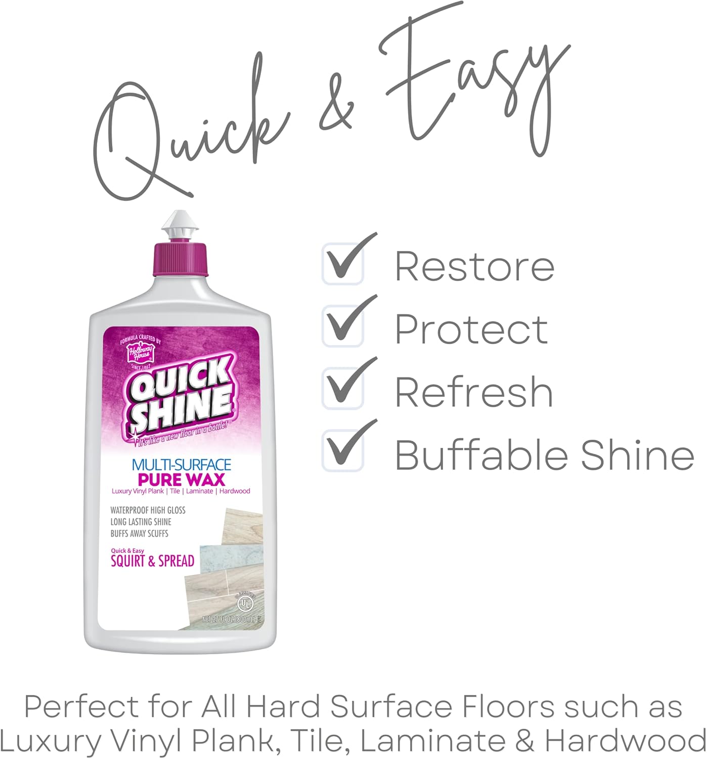 Quick Shine Pure Floor Wax 27oz | A Buffable, Waterproof Finish for Regular and Hardwood Floors | Restore Protect RefreshQuick Shine Multi-Surface Pure Wax adds a fast-drying protective layer and fills in micro-scratches evening out the appearance of floors for a refreshed new look. Quick Shine Pure Wax provides a water-proof high gloss and buffs away scuffs for a long-lasting shine.Quick Shine 2 Pack Smart Combo- Includes 1 Hardwood Floor Cleaner & 1 Floor Polish-Luster w/ Plant-Based Carnauba 27oz | Safer Choice | A Clean That Can Be Seen!Quick Shine brand provides consumers with superior floor care products that are designed with the environment in mind. Now Quick Shine offers the High Traffic Hardwood Combo Pack to clean AND protect your hardwood floors. The Quick Shine Hardwood Floor Cleaner naturally cleans dirt, grease and scuff marks without harsh alkalis or ammonia and leaves no haze, streaking or sticky film. We recommend using the floor cleaner with the Quick Shine Spray Mop Kit to make floor cleaning quick and easy. When it is time to renew the look of your floors, turn to the Quick Shine Floor Luster for a long lasting, deep rich shine. It has no noxious fumes and never has to be stripped. We recommend using the Quick Shine Hardwood Mop Kit for quick and easy application. Simply squirt on to a clean dry floor and apply with a dampened mop (should not be used in spray mops). Quick Shine floor care products are certified as using safer chemistry practices and has an ammonia and formaldehyde-free formula. Even the bottle is made from post-consumer recycled plastic. The Quick Shine Hardwood Floor Cleaner and Luster’s ease of application and ready-to-use formulas makes floor care a breeze. Seeing is believing - It is like a new floor in a bottle!