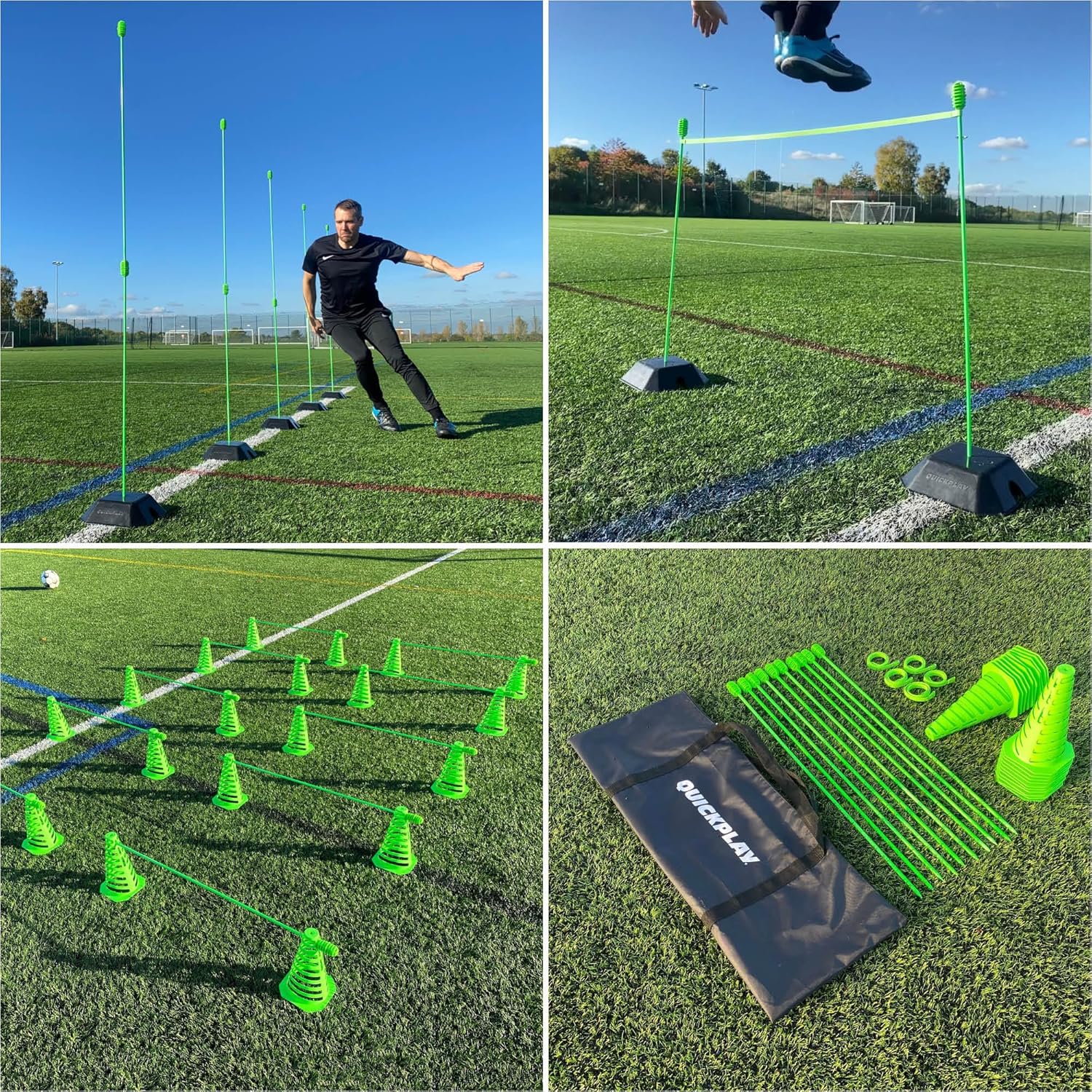 DEVELOP YOUR SPEED &AGILITY; SKILLS The QUICKPLAY PRO Adjustable Height Speed &Agility; Set helps you to improve footwork, speed and agility. An essential part of training in all sports, including soccer, baseball, football, field hockey, track & field and more! THREE KEY COMPONENTS A highly versatile set that gives coaches and players a wide range of training options, that includes: TEN x 3ft Agility Poles / Coaching Sticks, TWENTY x 9 inch slotted cones and FIVE x 10ft bungees. DUAL HEIGHT AGILITY POLES (x10) CAN BE USED AS 12X 3FT POLES - OR - 6X 6FT POLES Create soccer passing arcs / gates, corner markers, goal posts for training games, or when used with the slotted cones form up to 10 variable height speed hurdles. 9IN CONES (x20) The Slotted design allows these cones to collapse if accidentally stepped on, helping to reduce the likelihood of injury. Mark out a playing area, obstacle course or use as hurdles with included agility poles. ULTRA PORTABLE & EASY TO STORE Featuring a lightweight design, that packs down into an easy to carry bag. SUPERIOR VISUAL ACUITY Designed in a bright neon color to provide superior visual acuity than other agility poles, cones and hurdles. QUALITY DESIGN Each pole has a ground spike on one end and a honeycomb top connector on the other end for easier ground insertion and is also used to link two poles. VERSATILE SET TRAIN YOUR WAY! The QUICKPLAY PRO Speed + Agility Set can also be used with the QUICKPLAY SLOTTED CONE SET and the QUICKPLAY PRO AGILITY POLE SET.