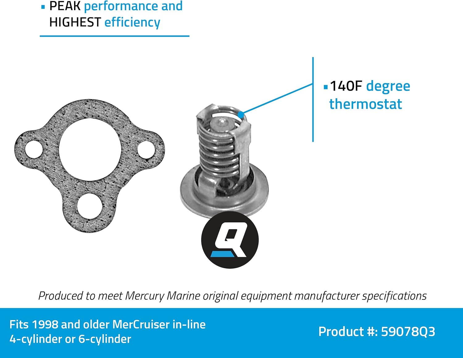 Thermostat 59078Q3 kit is for use in older MerCruiser in-line 4-cylinder and 6-cylinder engines made by General Motors. The two-piece kit includes the thermostat and cork gasket. The Quicksilver brand is the leader in delivering uncompromising engine oils, parts and accessories to the marine industry for over 65 years. Quicksilver is the premier supplier of Mercury Marine Original Equipment replacement engine parts, oils, and accessories, but also works to serve all Original Equipment brands in the marine and powersports industries. It has earned a loyal following by providing the highest quality products that are tested through some of the most rigorous environments and testing procedures. No aftermarket company comes close to the level of research and design as Quicksilver; buying Quicksilver is buying performance, protection and peace of mind.