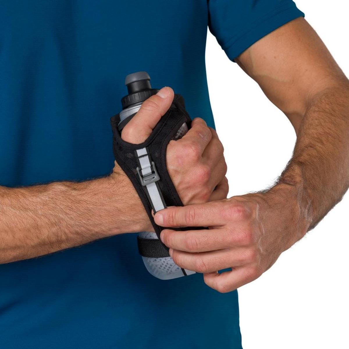 The QuickSqueeze Plus View handheld lets you access your phone and carry water on the go. The bottle and grip-free hand strap provide a comfortable, convenient solution for keeping fluids cooler, 20% longer. Hydrate faster and easier with the double-wall insulated flask and push-pull blast valve nozzle, which keeps liquid 20% cooler than competitors. The updated design features a more secure hand strap system using Nathan's grip-free technology, a softer bottle for easier squeezing, and a TPU grip to keep the bottle in place despite hand sweat. It also includes a phone pocket for most smartphones, a small zipper stash pocket for valuables, a high flow cap for quick hydration, and a reflective print design for improved visibility. The bottle is 18oz/532mL and insulated.