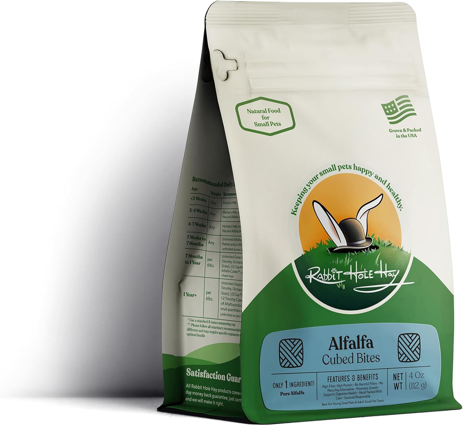 Rabbit Hole Hay's All Natural Alfalfa Hay Cubes offer a premium feeding solution for your small pets. Each 10 lb box contains pure alfalfa hay, compressed into convenient cubes that are easy to handle and feed. These hay cubes are free from additives and preservatives, providing your pets with essential nutrients for healthy growth and digestion. Designed for rabbits, guinea pigs, chinchillas, and other small herbivores, our alfalfa hay cubes ensure your pets receive the best natural feed available. Packaged to maintain freshness and quality, this 10 lb box provides a long-lasting supply of high-quality hay cubes.
