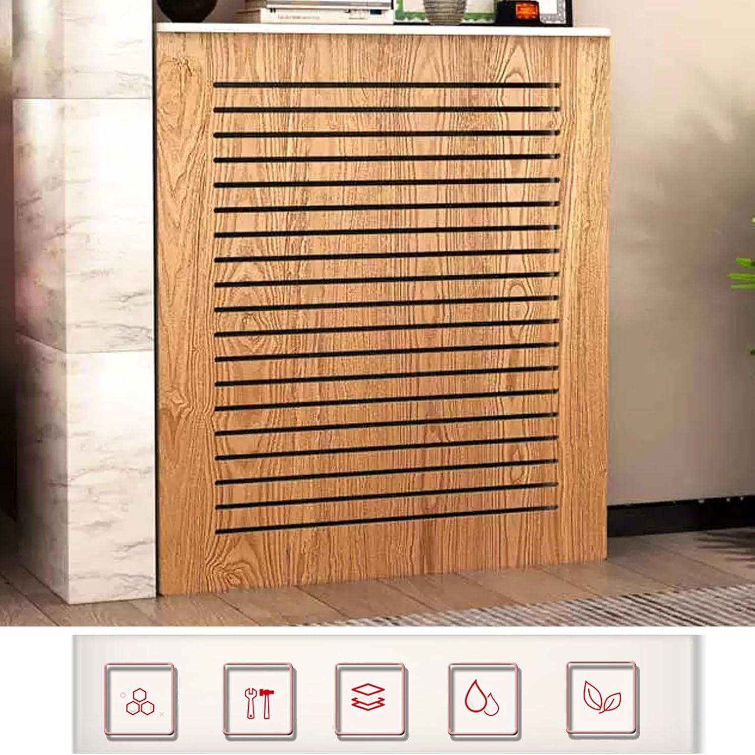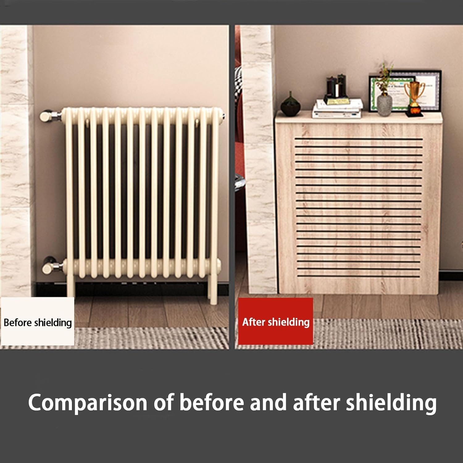 The heating cover cabinet is designed with modern board, which is suitable for any decoration. Protective heating cabinet multiple ventilation holes are designed to evenly distribute heat throughout the room, providing a safe and comfortable environment for everyone.This YUGXTH radiator shelf has a shelf on the top, which can make full use of the space to store books, decorations and other items. Product Description:* Product Name: Modern Radiator Cover, Radiator Cover Insulation Cabinet, Insulation Cabinet Rack Bathroom Floor Cabinet* Product Color: As shown in the picture* Product Material: PVC Wood Plastic Board,* Whether Assembly is Required: Yes* Accessories: Screws and Installation Tools.* Cleaning instructions: Wipe with a dry cloth* Packing List: 1*Radiator Cover(excluding decorations)* Usage Scene: Living Room, Kitchen, Bathroom, Corridor Warm Tips:1. Size Description: The product is completely measured by hand and may have an error of 1-2 cm. Please refer to the actual items received.2. Picture description: The product is real. Due to problems with light, angle, display, etc. there may be slight chromatic aberration, please forgive me.