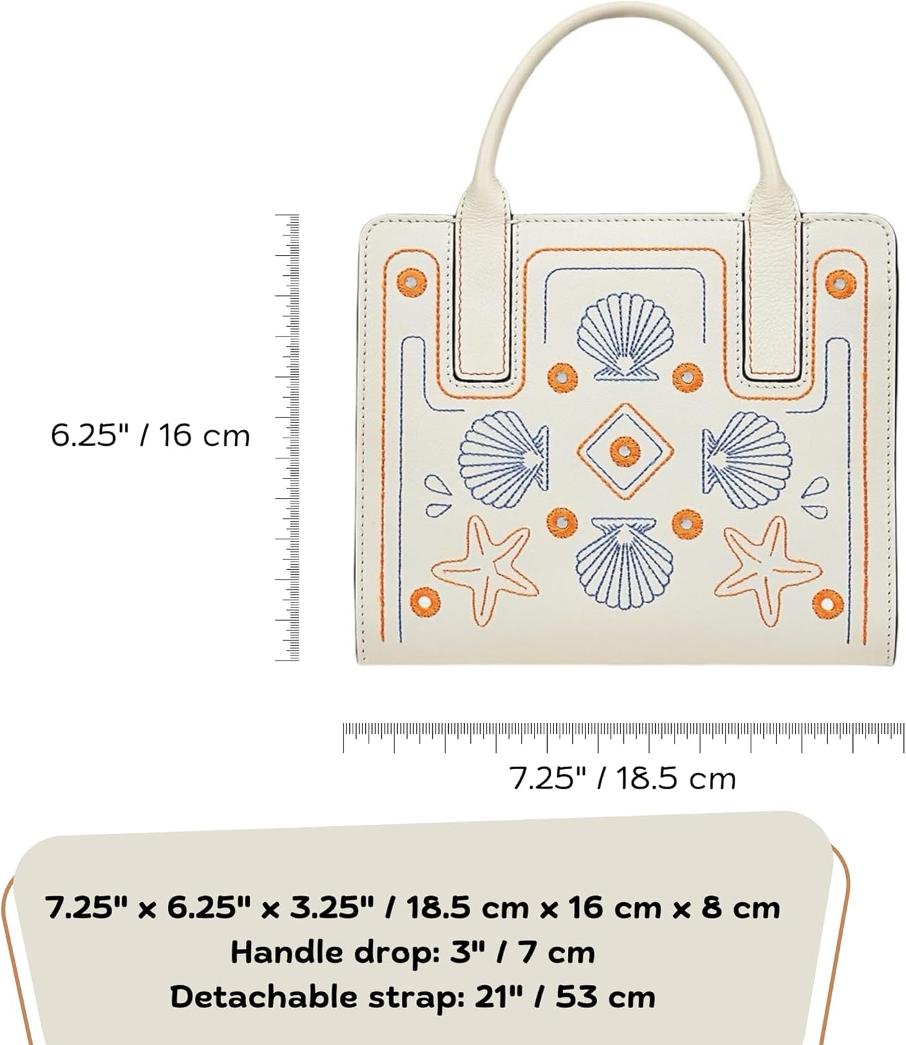 Crafted in leather - Stitch and mirror embroidery - Faux suede lining - Twin handles with inlaid tabs - Zip fastening with branded metal puller - Interior slip pocket - Metal feet - Detachable crossbody strap - Detachable branded key fob - 7.25"L x 6.25"H x 3.25"D