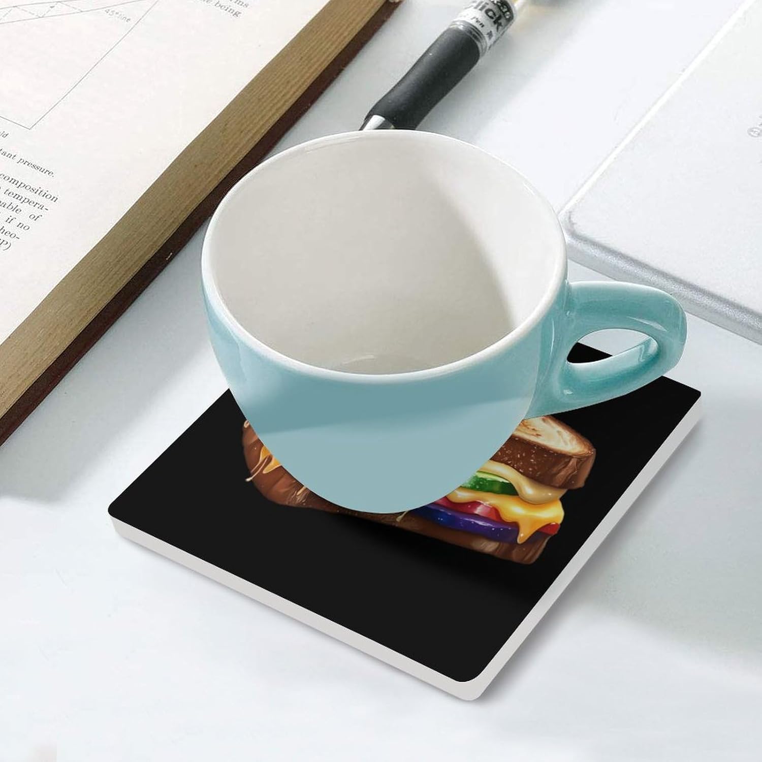 Rainbow Grilled Cheese Sandwich Funny Ceramic Coasters for Drinks Absorbent Cup Holder Tabletop Protector with Cork Base