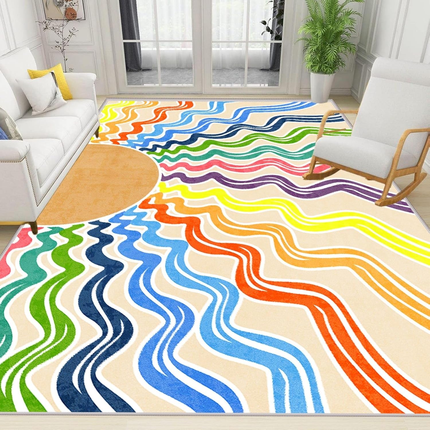 A minimalist sun-patterned rug to create a warm and comfortable home atmosphere.Q&AQ1: Will this Bohemian rug fade?A1: No, it will not fade.Q2: Why is this rug so soft?A2: Our rainbow rug offers you an unparalleled tactile experience.Q3: How do I clean this rug?A3: Please try cleaning the rug with a low-power handheld vacuum cleaner. The rug can be hand-washed or machine-washed, then air-dried or hung to dry.Product FeaturesMade with high-quality materials and sublimation printing technology, it offers a comfortable feel underfoot, is durable, and resistant to fading.The bottom features a non-slip rubber backing design to ensure the rug stays firmly in place and doesn't slide.Effectively reduces noise, creating a quiet and comfortable home environment.Easy to maintain – simply vacuum with a low-power vacuum cleaner or wipe with a damp cloth as needed.Shopping Guide1. Our rugs are vacuum-packed, so wrinkles may appear. The rug will become fluffy again after a few days and will not affect use.2. Please wash the rug according to the washing instructions. Do not soak after washing.3. If you notice any odor upon receiving the product, please place it in a well-ventilated area for a period of time.4. Due to differences in monitors and camera shooting effects, there may be slight color differences between the picture and the actual product.5. If you have any questions, please feel free to contact us.