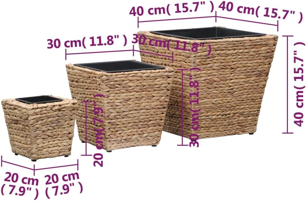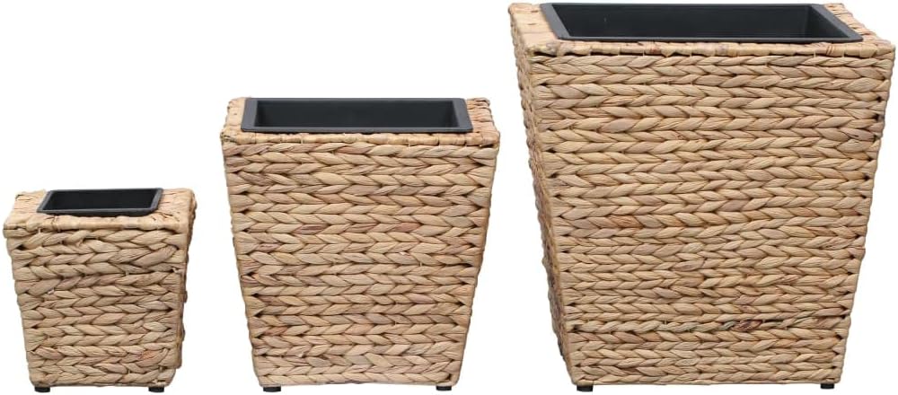 This set of three rustic planters is a perfect mix of practicality and style, made to enhance any living space while showcasing beautiful plants. Crafted from natural water hyacinth, these planters bring an earthy sophistication to your home decor and are ideal for display in any living room, hallway, or balcony.Versatile Display: This planter set is great for showing off your favorite plants, bringing a bit of nature indoors. Think of vibrant blooms or lush greens beautifully arranged in these rustic pots, making any room feel warm and inviting.Natural Material: Made from water hyacinth, these planters have a rustic charm that goes well with different home styles. The woven texture adds to the visual appeal, turning simple plant displays into attractive features.Removable Pots: Each planter has a removable inner pot, making it super easy to water your plants. This makes maintenance straightforward without having to haul around heavy planters.Distinct Sizes: With a range of sizes from large to small, these planters give you lots of options for displaying your plants. You can mix and match or group them for more impact, showing off your favorite greens.Rustic Style: The overall rustic design highlights natural beauty while being practical. They make a fantastic addition to any home or balcony, bringing an organic feel to your indoor space.Number Of Items: 3Color: BeigeShape: SquareMaterial: Natural Water hyacinthIndoor/Outdoor: Indoor OnlyRoom: Living RoomDimensions: 15.7 x 15.7 x 15.7 inWeight: 9.26 lbsDrainage: NoDelivery Contains: 3 planters in different sizes with removable inner potsAssembly Required: No