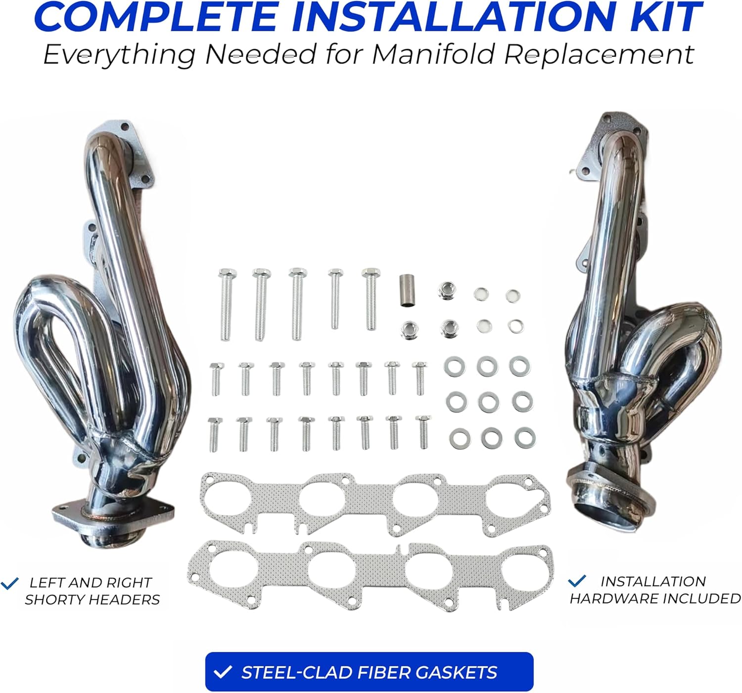 Ram 1500 5.7 Hemi Shorty Headers engineered as a direct replacement for factory exhaust manifolds on 2009–2018 Ram 1500 5.7L Hemi and 2019–2024 Ram 1500 Classic 5.7L old body style trucks. Designed specifically for the DS platform configuration, these stainless shorty headers replace common failure-prone cast manifolds while retaining factory catalytic converter placement and OEM emissions equipment layout. Factory exhaust manifolds on 5.7 Hemi Ram 1500 trucks are known to crack, warp, or break mounting bolts over time due to repeated heat cycles. This often results in ticking noise on cold start, exhaust leaks, and costly repair labor when bolts shear in the cylinder head. These 304 stainless steel shorty headers are engineered as a durable manifold replacement solution, providing long-term resistance to corrosion and thermal fatigue compared to factory cast iron units. The application-focused design bolts directly to factory cylinder head mounting locations and connects to the OEM catalytic converter position without cutting, welding, or fabrication. This maintains the original exhaust routing and emissions configuration while upgrading material strength and long-term reliability. Constructed from polished 304 stainless steel with thick laser-cut flanges and mandrel-bent tubing, these headers are built for consistent sealing and durability through repeated heat cycles. Precision welding at all primary joints ensures structural integrity under daily driving conditions. Compatible with: 2009 2010 2011 2012 2013 2014 2015 2016 2017 2018 Ram 1500 5.7L 345 CID Hemi V8 2019 2020 2021 2022 2023 2024 Ram 1500 Classic 5.7L Hemi old body style Not compatible with 2019+ new body Ram 1500 models. Fits 2WD and 4WD configurations. Includes steel-clad fiber manifold gaskets and installation hardware for a complete exhaust manifold replacement kit. Ideal for owners addressing: Ram 1500 cracked exhaust manifold 5.7 Hemi ticking noise Ram 1500 broken manifold bolts Ram 1500 exhaust manifold leak Ram 1500 manifold upgrade Designed as a stainless direct bolt-on alternative for factory exhaust manifolds, delivering durability and fitment clarity without unnecessary modifications.