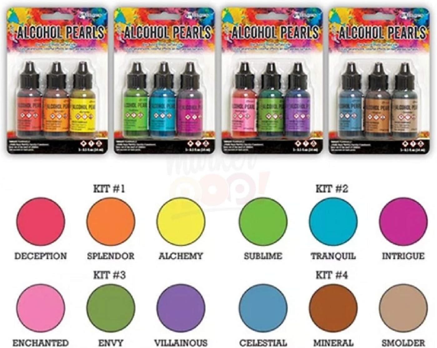 Tim Holtz Alcohol Pearls are permanent, fast drying, pigment and dye inks formulated to create pearlescent colorful effects. Use with Tim Holtz Alcohol Inks and Alcohol Ink Blending Solution to achieve luminous layers on YUPO, Alcohol Ink Cardstock, Alcohol Ink Surfaces, and other non-porous surfaces. Available in 12 colors open stock, each in a .5 fl. oz. bottle or four kits, each containing 3 colors. Includes Deception, Splendor, Alchemy, Sublime, Tranquil, Intrigue, Enchanted, Envy, Villainous, Celestial, Mineral, and Smolder.