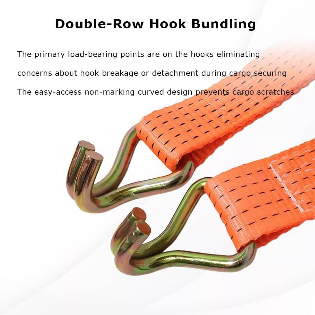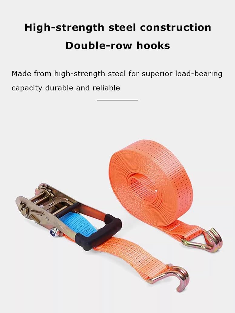 Our webbing features woven interlocked edges for added strength. and abrasion-resistant, designed to withstand harsh conditions while maintaining its colorfast quality. Engineered for optimal durability and flexibility, it’s built to last and perform in demanding environments.Product SpecificationsProduct Name: Ratchet StrapAvailable Length: 5cmx10m/1.96x393inWidth: 1.98inchAvailable Colors:White , OrangeMaterial:High strength polypropylene + steel frameWarm tip:Do not use as a vehicle tow rope, car towing needs to be more load-bearing ropeHow to Tighten Strap: 1. Pass the strap under the tensioner rotating shaft; 2. Pass the strap through the center slot of the tensioner rotating shaft; 3. Pull the tensioner handle back and forthHow to Release Strap: 1. Fasten the safety plate outwards; 2. Open the tensioner to level; 3. Pull out the strap