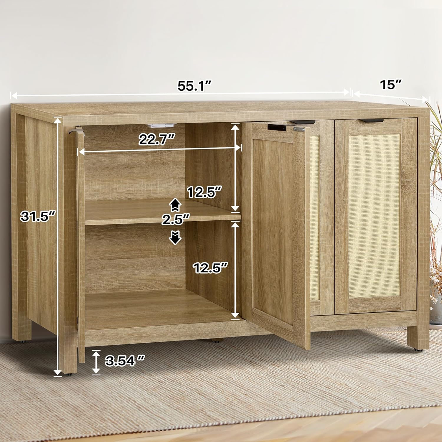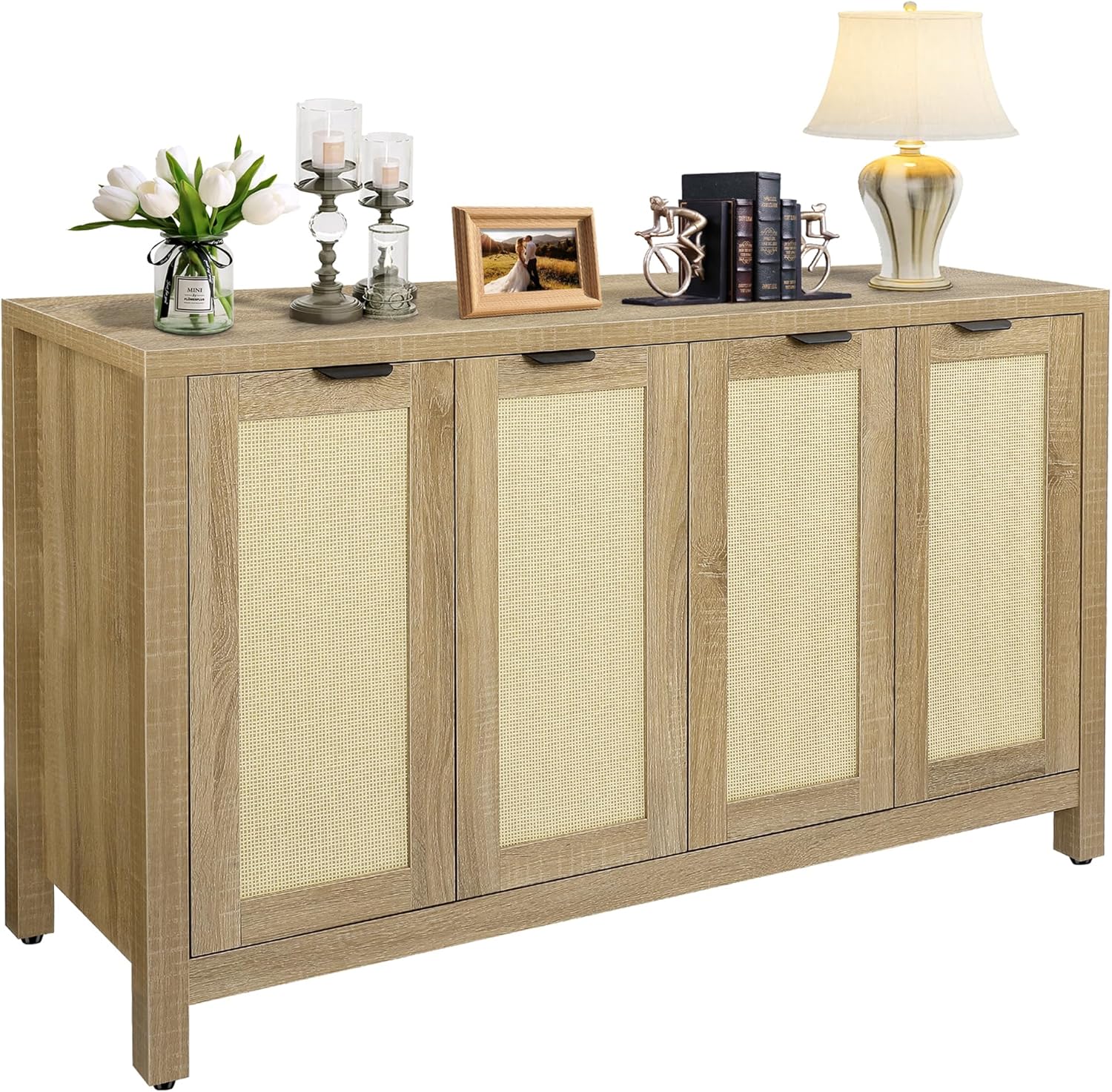 The Sideboard Buffet Cabinet combines classic and modern styles with its 4 rattan decorative doors, bringing a boho-chic vibe to any space. Built with sturdy construction and thickened solid wood legs, the storage cabinet ensures durability and stability. Each compartment is equipped with adjustable shelves, offering three different height options. It offers spacious storage shelf with four doors, making it perfect for organizing kitchen essentials, dining ware, or hallway items. Multifunctional and versatile, this rattan cabinet can be used as a TV stand, buffet console table, a kitchen storage cabinet, or console table accent cabinet in the hallway entryway. Additionally, the cabinet is easy to clean and assemble, making it a practical and stylish addition to your home. Material: MDF chipboard, Rattan, Solid Wood Overall Dimensions: 48.4”W x 15”D x 31.5”H55”W x 15”D x 31.5”H Maximum Load Capacity: Table top: 135 lbs; Inner Shelf: 50lbs Package Included: 1x Sideboard Cabinet 1x Accessory Kit 1x Instruction Manual