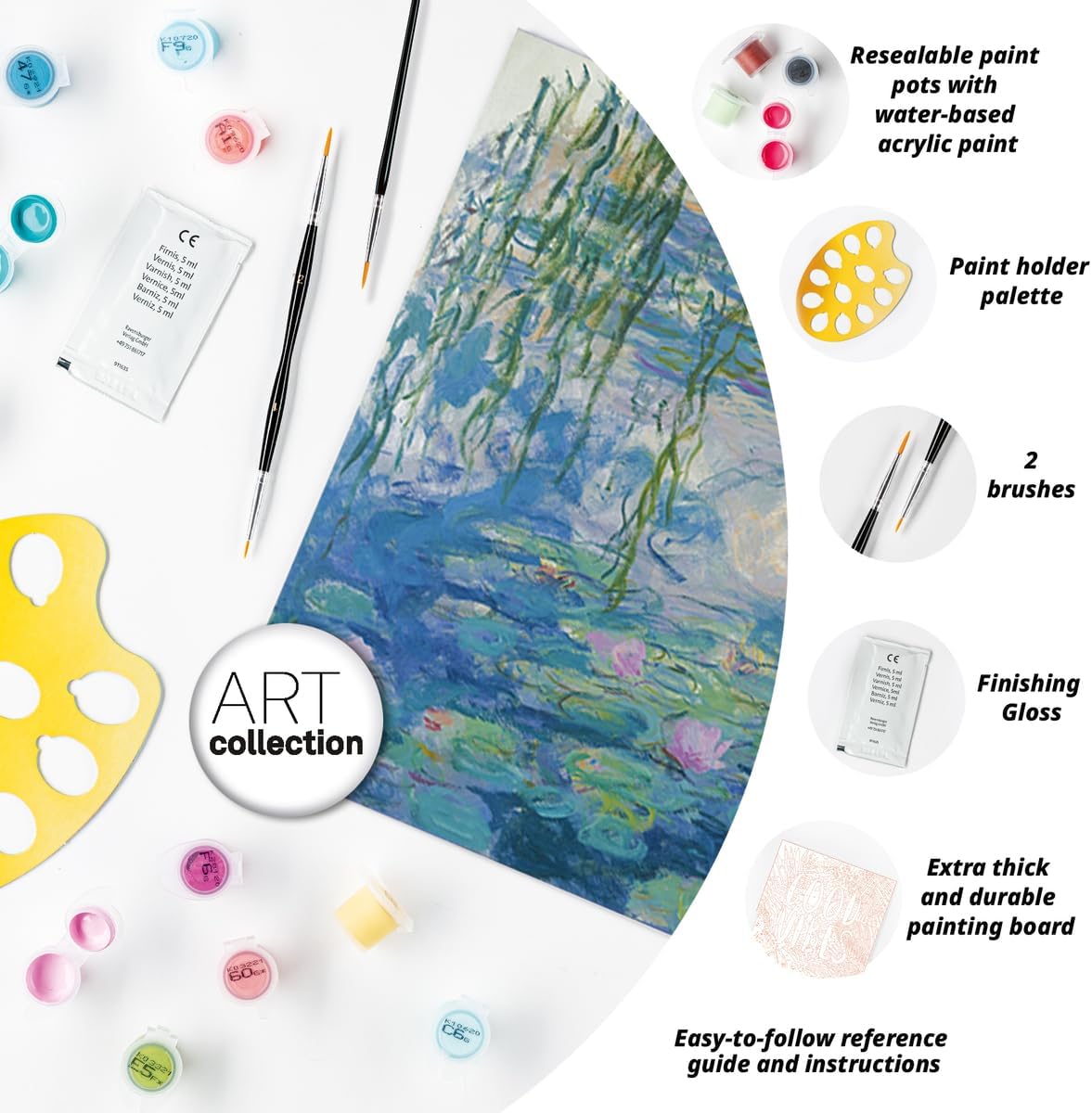 Make a wonderful impression as you spend tranquil time in Giverny, France with “Waterlilies” by Claude Monet with this CreArt Painting by Numbers set! Make your very own masterpiece! This lovely CreArt paint-by-number kit depicts one of approximately 250 breathtaking paintings from Claude Monet’s “Waterlilies” series. Paint a scene of serenity for some relaxing “me time”, with everything you need included. Simply fill in each clearly numbered section and watch the image emerge! The prepared patterns and high-quality, odorless acrylic paints ensure excellent results. De-stress and find success as you discover the joy of art in your heart today! Part of our “Art Collection” celebrating world-famous artists and their renowned works, the prepared patterns in this Painting by Numbers set lets you create a personal masterpiece you’ll be proud to display! A meditative activity, painting can help relieve the stress of the day while providing a satisfying sense of accomplishment! With the same dependable quality you know from our puzzles and games, this premium paint-by-number kit comes with everything you need: a durable, smooth white painting board with clearly numbered sections; easy-open/close water-based, odorless acrylic paints in matching numbered pots; finishing gloss; dual-tipped, wood-handle paintbrush with fine points (#1, #2) for precise details; artist pallet to keep paint pots steady; and easy-to-follow guide sheet. Frame not included. Made in Czech Republic. Copyright: © Musée Marmottan Monet, Paris/Bridgeman Images.