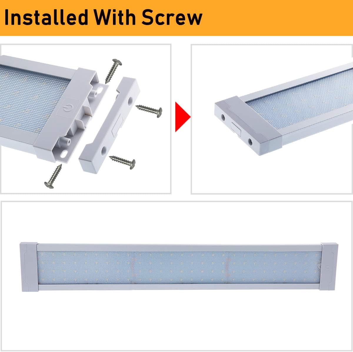 Specifications: Wattage: 21.6 Watt per Light Voltage: 12V/24V DC Current Draw: 1530 mA@12V, 760 mA@24V Switch Type: On/Off Touch-Activated Switch Color Temperature: Cool-White Finish: Grey Working Temperature: -40℃ ~ +50℃ Connection Type: Hardwired Housing Materials: Aluminum Lens Materials: Polycarbonate Lens Color: Clear Power Wire Length: 15.7 in. (40 cm) Wire Gauge: 20 AWG Lumen Output: 2160 lm Waterproof Rating: Non-Waterproof Product Type: Interior Light Net Weight per light: 1.94 lbs. (0.88 kg) Product Height: 0.68 in. (17.3 mm) Product Length: 25.98 in. ( 660 mm) Product Width: 3.92 in. (99.6 mm) Quality Warranty: 2 YearsSafety & Notes: 1. The light is the low voltage LED lights primarily designed 12-24 VDC mobile lighting. When installed for household, it is strongly recommended to be processed by professional electrician in strict accordance with the safety standard. 2. For your safety, please cut off the power source before performing any installation or wiring procedures. 3. When lights illuminated, direct eyes exposure to the LED light beam need to be avoided. 4. Power button is touch sensitive for on & off control 5. Indoor or cabin use only. Without immerse in the water. Installation Instructions: 1. Remove two endcap screws to access mounting holes. 2. Mount LED fixture to surface using 4 mounting screws, and then replace endcaps. 3. Connect RED wiring to Positive, and the WHITE to Negative