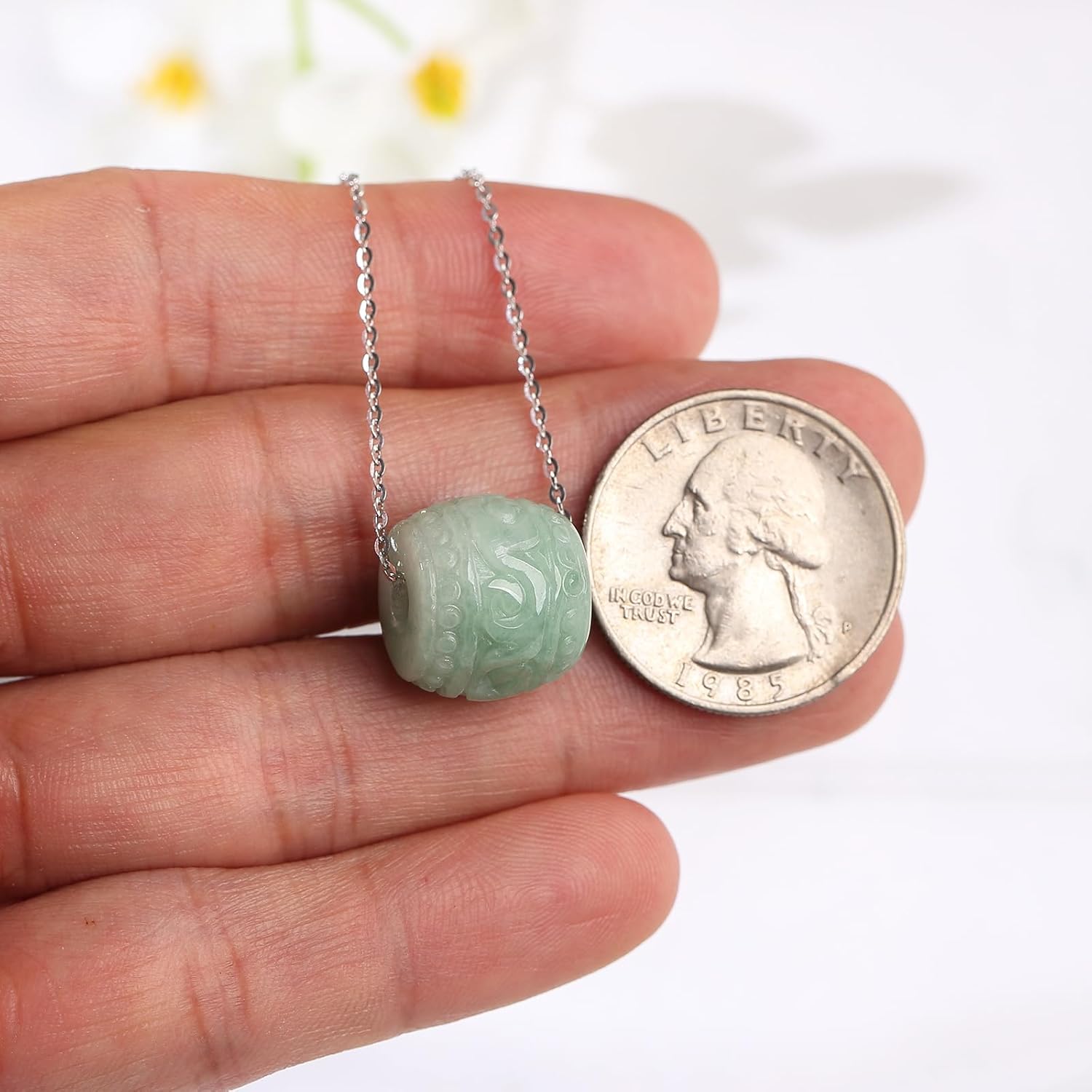 We are committed to providing high quality jadeite jewelry to our customers. QVFVJA promise to provide 100% real natural grade A jadeite. Carved light green jade round pendant, the classical carvings are exquisite and detailed, matching with a white gold plated 925 sterling silver chain. it is elegant and durable, comfortable to wear. We call it "Lu Lu Tong", symbolizes that everything goes well. It can bring good luck, health, wealth to our life. This round healing jade stone pendant is an ideal spiritual jewelry for women.