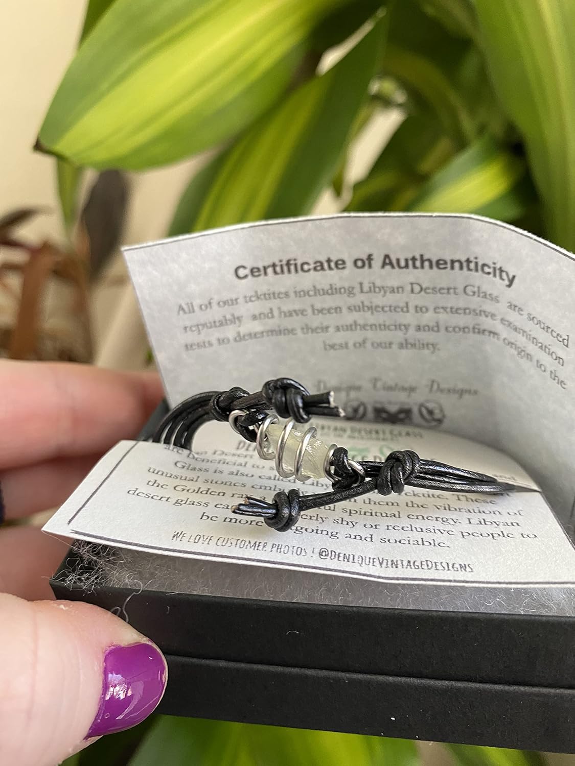This is a beautiful handmade bracelet done with a piece of raw genuine Libyan Desert Glass and wire of your choice. Comes with a Certificate of Authenticity! Comes on soft Greek leather or Black Waxed cotton cord. This necklace would make a beautiful gift for Valentine's Day, a birthday, anniversary, Christmas, Mother's Day, or any special occasion. It could be worn as a casual necklace or complement any fancy evening attire. About Libyan Desert Glass: A product of a massive meteor strike that took place in what is now modern-day Libya roughly 29 million years ago, Libyan Desert glass is known as the golden tektite, due to its beautiful straw yellow color. This amazing material has some of the properties of volcanic glass type gemstones like obsidian, but others that are unique, with flecks of the meteor itself strewn throughout the stone. Libyan Desert Glass is as incredibly rare as it is beautiful and is thought to be a powerful stone of protection, healing, and divinity; sought after by healers and gem enthusiasts around the world for its strange resonance and properties. All of our Libyan Desert Glass jewelry comes with a Certificate of Authenticity and is not made into jewelry until we have performed our own tests here at the shop. *Note - You will receive a bracelet like the one pictured. As this is a production piece, each piece will be slightly but look just like the one in the picture.