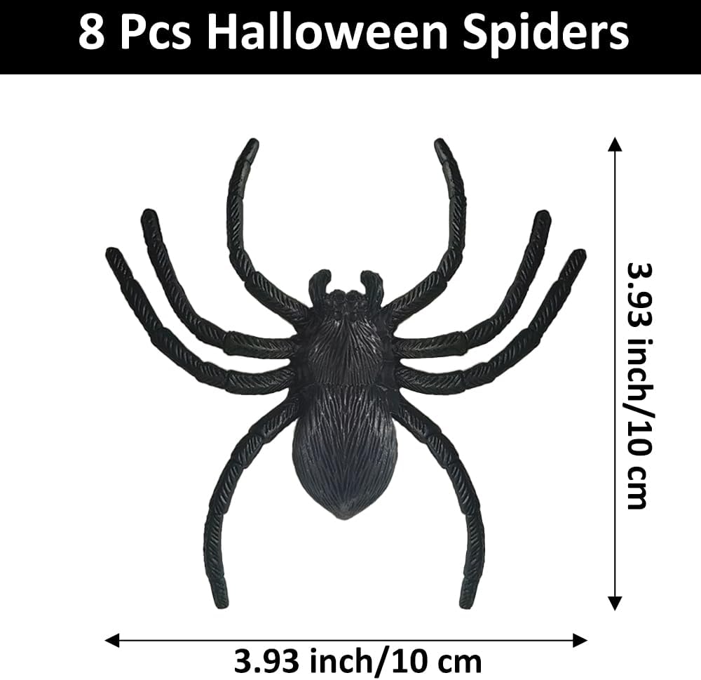 Realistic Plastic Spiders Halloween Decorations - 8 PCS Black Big Halloween Fake Spiders for Web Decorations, Realistic Fun Toys Prank Props Scare Practical Surprise Joke Party Decor, 3.9 x 3.7 Inch