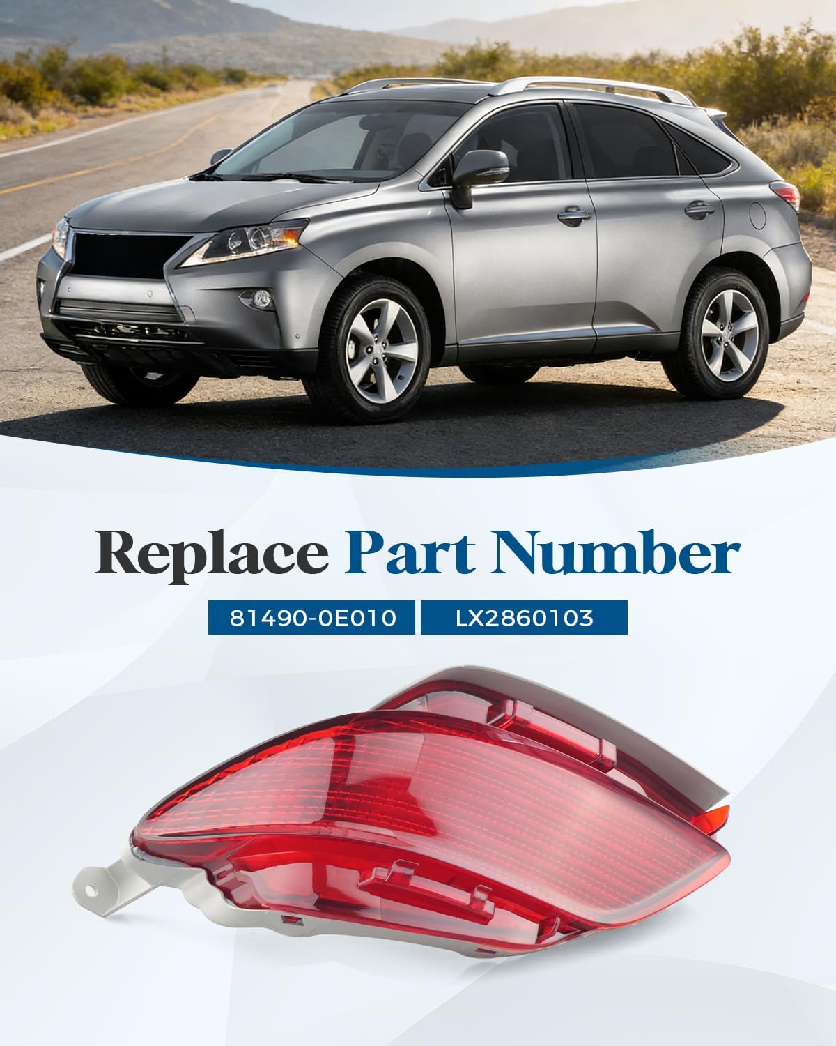 Adaptation: Fit for Lexus RX350 RX450h 2010-2015 (Only for US version)Replacement Part Number: 81490-0E010 LX2860103Package Contents: 1*rear left/driver side marker lightEnhanced driving visibility: Installed at the rear of the vehicle, it combines side marking and reflective functions, improving the visibility of the vehicle to the side and rear at night, in low light or in adverse weather conditions, thereby enhancing driving safety.Precise Size Match: The dimensions and installation position are precisely matched to the vehicle's design, allowing for the replacement of aging or broken rear marker lights on older vehicles while maintaining the overall integrity of the vehicle's appearance.A Stable and Reliable Replacement Solution: Restores the function and appearance of the original side marker lights, balancing safety and vehicle aesthetics.Note: Please pay attention to the replaces part number and vehicle model to avoid mismatching between the product and the vehicle model.Service: If you have any questions about our product, please reply to us by email and we will help you resolve any issues as soon as possible.