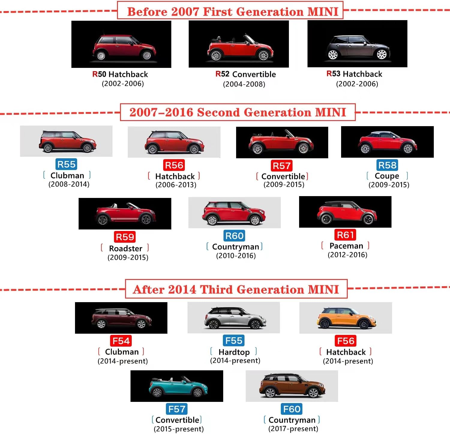 If you can't confirm your car R-series or F-series model number(They have different shapes).please contact customer service in advance. we will help you to choose the right mini accessories. Only Fit for Without Light Hole Side Wing Mirror Mini Cooper accessories One//D/SD/S/JCW The Third generation F Series: F54 Clubman 2014—2019 F55 Hardtop 2014—2019 F56 Hatchback 2014—2019 F57 Covertible 2015—2019 F60 Countryman 2017—2019 Package: 1 Pair Mirror Covers (left and right side) Installation steps. 1.Take out the decorative shell and pay attention to distinguish the left and right. Compare the installation location 2.Please wipe clean the parts that need to be used first. Ensure that the area is clean and dry. 3.Remove a small section of the built-in tape inside the product. In order to facilitate installation, do not remove all adhesive tapes. 4.After adjusting the position, stick the decorative shell onto the original car parts and press the decorative shell tightly, after ensuring that the installation position is correct, remove the remaining tape and press it for another 1-2 minutes. 5.Finally remove the transparent protective film. (The protective film comes with the factory. Please remove it after confirming that the installation is correct. Otherwise, it will affect the return of the product.)