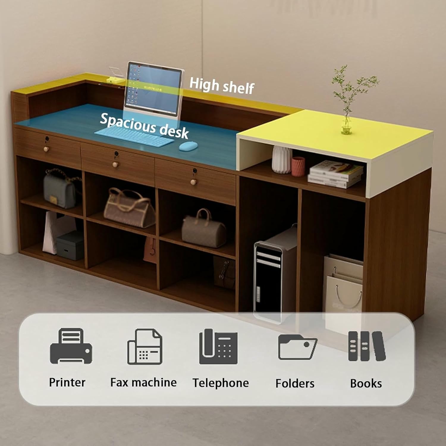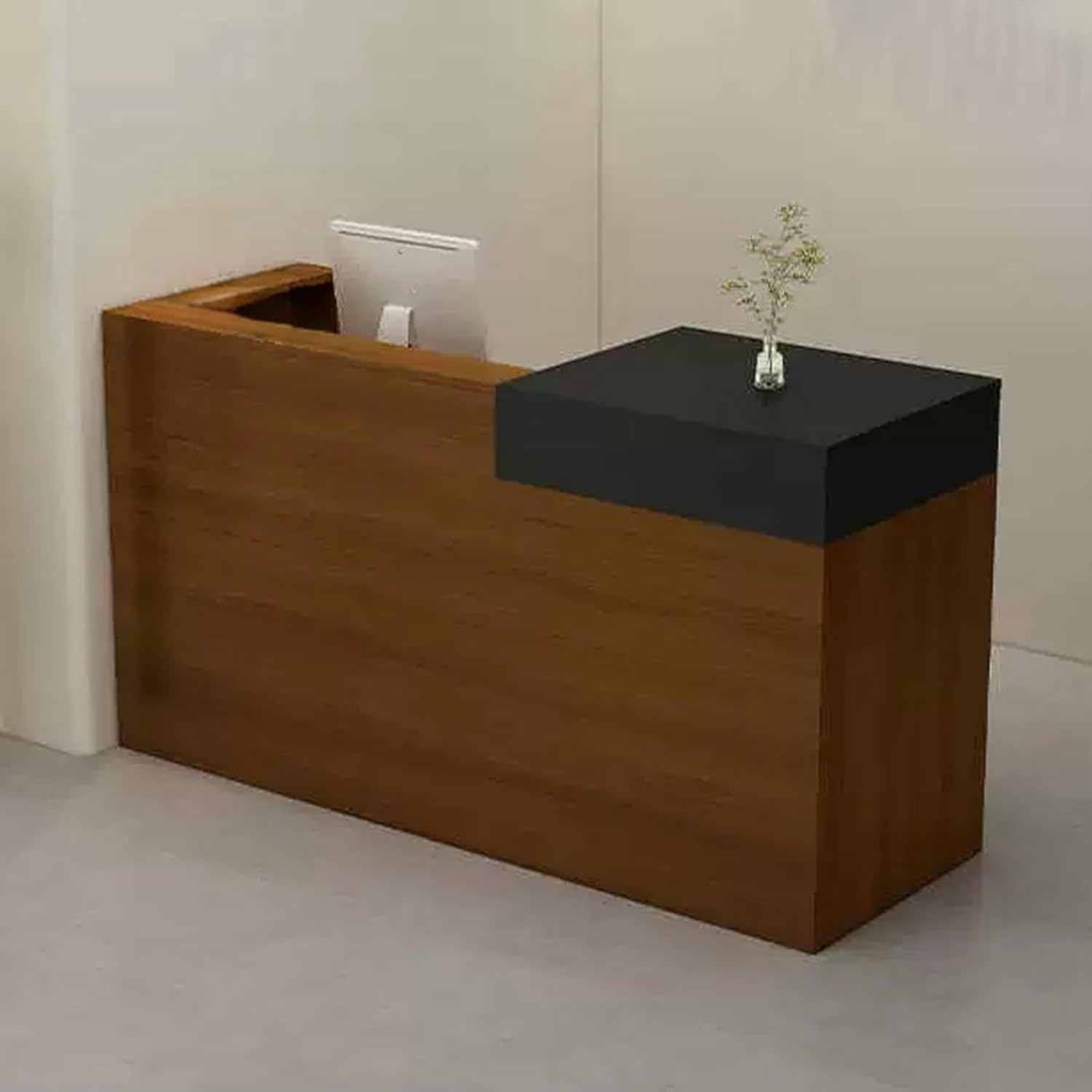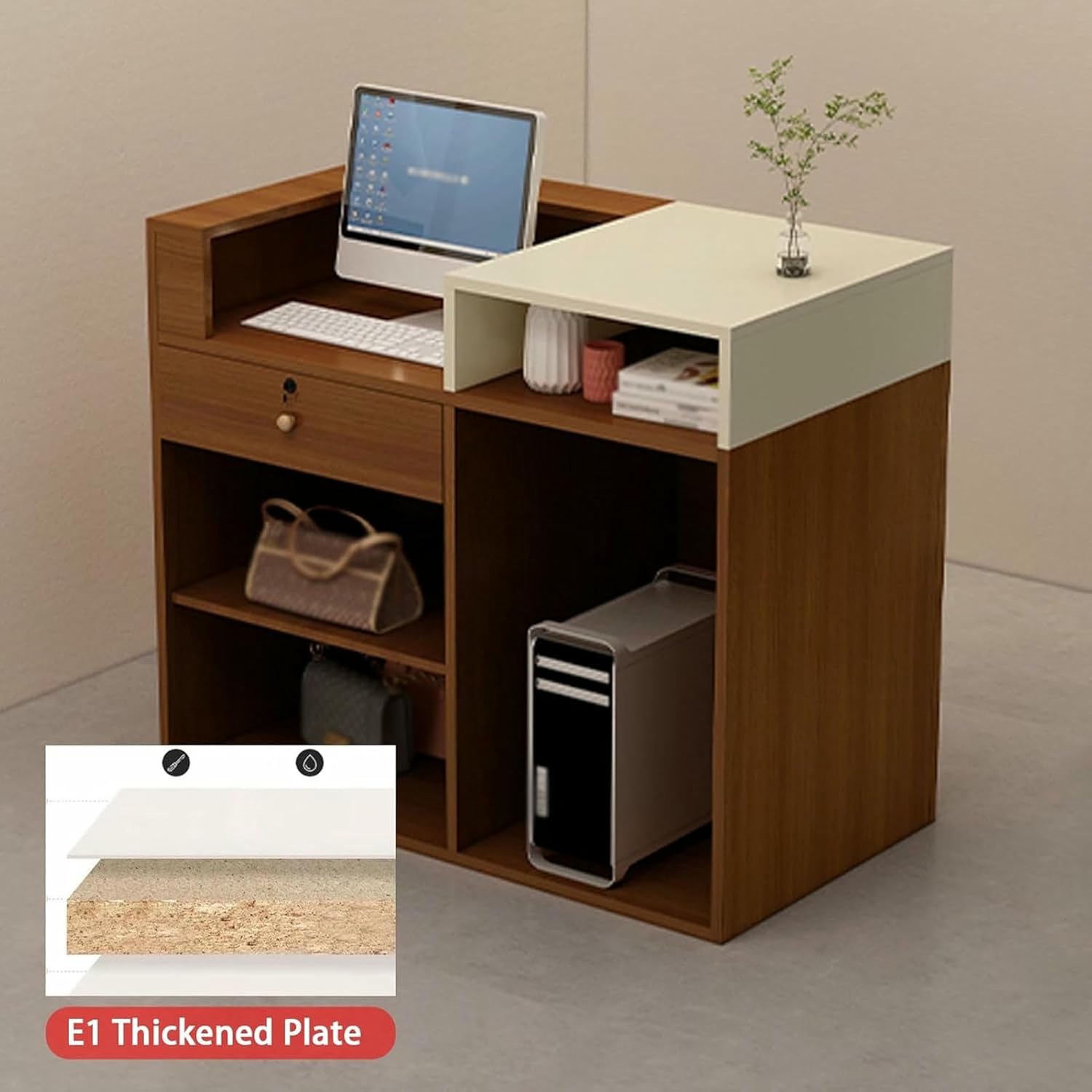 This retail reception counter is designed for small spaces. It uses simple lines and clever design to maximize the use of every inch of space, providing ample working area without appearing crowded17mm plate, stable structure, uniform internal structure, tight textureLocked drawer design, locks privacy, makes office more relaxed and comfortableThickened double countertop design, high countertop storage can be shielded, low countertop office, small space can be usedOpen multi-compartment storage space, convenient for display, storage and takingSpecificationsProduct name: Cash registerColor: Black+white, Black, Black+brown, Beige+brown, White+beigeMaterial: E1 boardLength: 90cm/35.4in, 100cm/39.3inWidth: 50cm/19.6inHeight: 100cm/39.3 inchesProduct style: modern and simpleApplicable scenarios: clothing stores, beauty salons, etc.Product includes: 1*reception deskAttention.1. Due to differences between monitors, there may be slight color difference.2. Due to the measurement method, measurement method and other factors, there may be slight error.