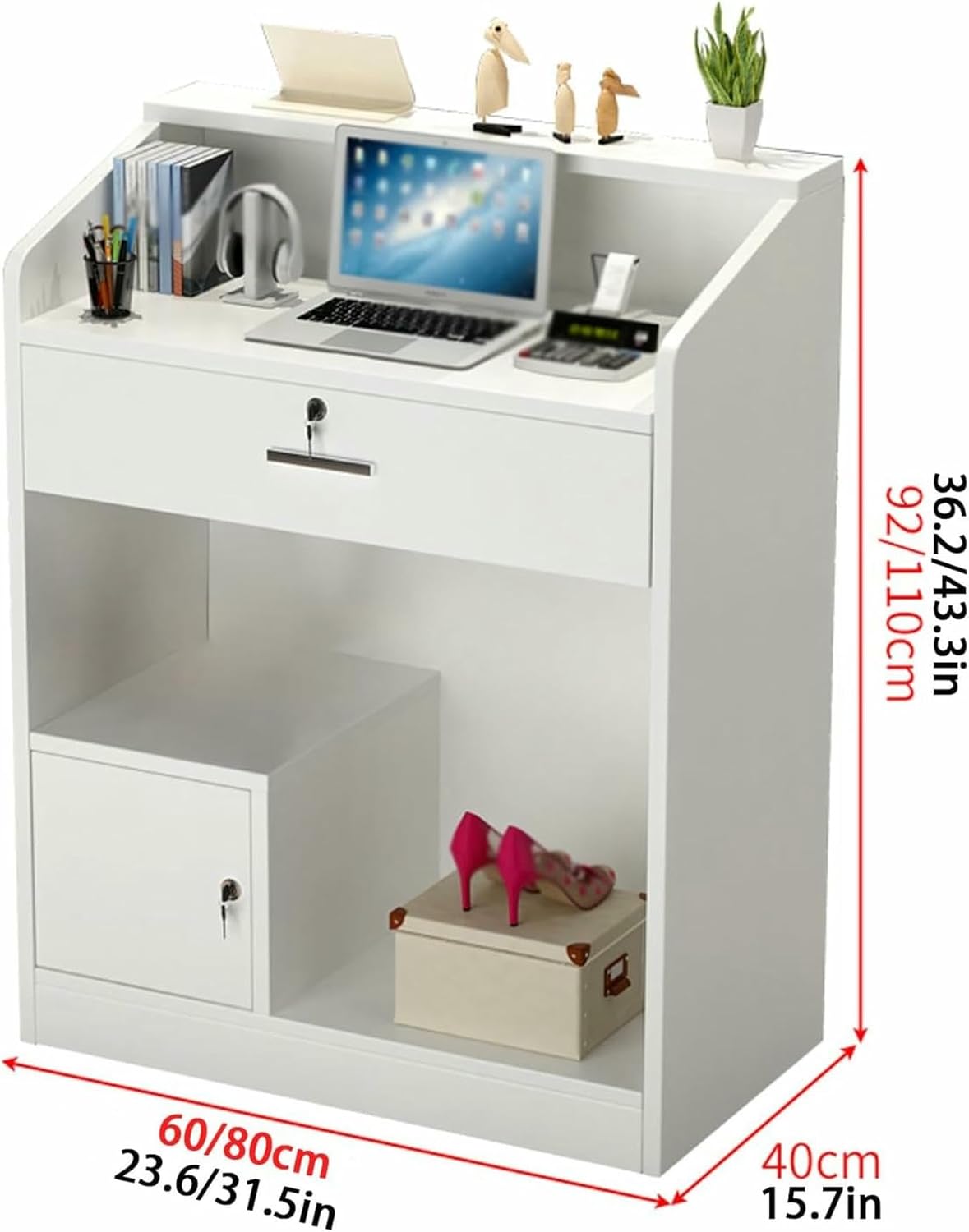Large reception table with light is perfect for your office.This front counter provides additional storage space, also suitable for your multiple storage and display needs. Reception counter also the top shield boards and lockable drawer can protect your privacy.Specifications:Product name: small reception desk, Material: WoodColor: Natural , WhiteStyle: modern and simpleLength: 60cm/23.6in,80cm/31.5in, 100cm/39.3in,120cm/47.2inWidth: 40cm/15.7inHeight: 90cm/35.4in,110cm/43.3inApplicable scenarios: clothing stores, beauty salons, etc.Package Includes:1 x Cashier Counter.Attention.1. Due to monitor differences, there may be slight color difference.2. Due to the measurement method, measurement method and other factors, there may be a slight error.