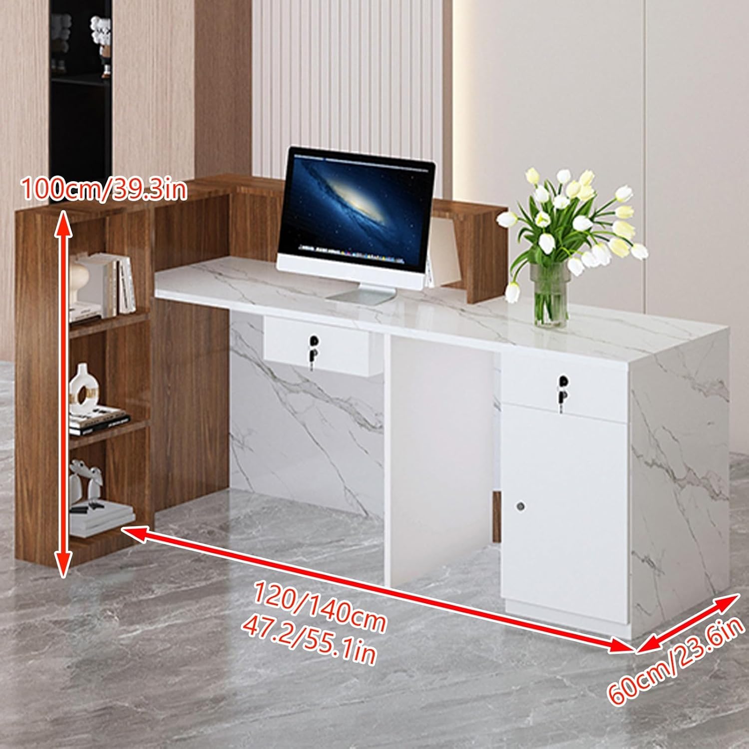 Which offers sufficient space for computers, telephones, writing materials, and other office essentials. Whether you use it as a working office desk or a reception desk, it is a good choice!What’s more, the smooth desktop allows you to clean it with a soft cloth and helps you reduce the cleaning burden.Our reception desk offer dust-proof drawers with locks ensure a tidy workspace, prevent loss of valuables and provide privacy. The desktop features wiring holes to solve complex wiring problems.Product name: Cashier, Reception Desk, Front Desk, Front Counter, Counter Desk, Reception Counter, Retail CounterProduct style: simpleProduct color: multiple colors availableProduct material: Artificial boardApplicable scenarios: clothing stores, beauty salons, etc.Product Size:L: 120cm/47.2in, 140cm/55.1inW: 60cm/23.6inH: 100cm/39.3inNotice:1. Note: Due to the particularity of the furniture, there will be slight errors in the finished product, which is normal. The data is for reference only and must be based on the actual product. We hope for your understanding!