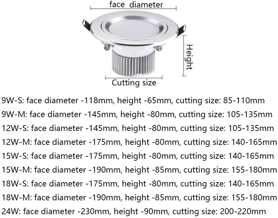 Brand StoryOZZKI has been in the lighting industry for more than 10 years ,is a professional production lighting , With unique style, quality products.Innovative light great for brightening up many areas. Classic fixture in various rooms of the home.Specification:Model: Ceiling lightDimmable: NoColor: sand silverLight source: LED lamp beadsColor temperature: 3000K/4000K/6000K/3000-6000KPower: 9W,12W,15W,18W,24WInput voltage: AC85-265V (not dimmable)Thermal conductivity: 180-190W/M.KColor rendering index: >80Luminous flux: 300 (LM)Life expectancy: 50000 (H)Installation method: embeddedMaterial: car aluminumSize: See the size chart for details9W-S: face diameter -118mm, height -65mm, cutting size: 85-110mm9W-M: face diameter -145mm, height -80mm, cutting size: 105-135mm12W-S: face diameter -145mm, height -80mm, cutting size: 105-135mm12W-M: face diameter -175mm, height -80mm, cutting size: 140-165mm15W-S: face diameter -175mm, height -80mm, cutting size: 140-165mm15W-M: face diameter -190mm, height -85mm, cutting size: 155-180mm18W-S: face diameter -175mm, height -80mm, cutting size: 140-165mm18W-M: face diameter -190mm, height -85mm, cutting size: 155-180mm24W: face diameter -230mm, height -90mm, cutting size: 200-220mmApplication: Home / Commercial LightingPackage list:1* downlightUnmatched Customer CareIf you ever encounter any issues, feel free to reach out to us, We will reply to any questions within 24 hours. Shop with confidence!