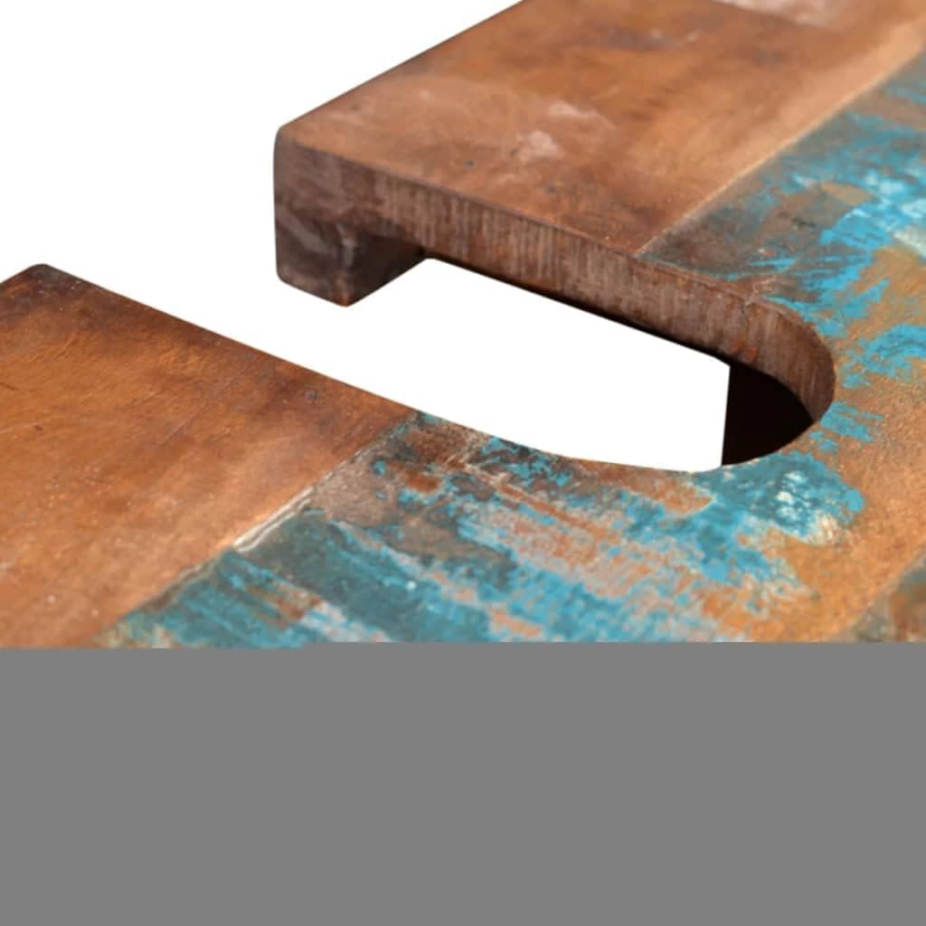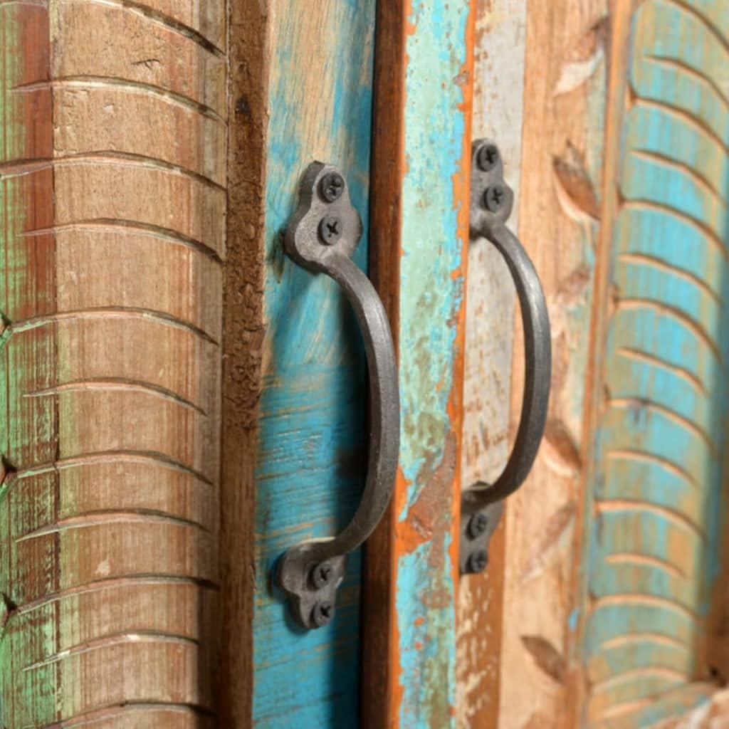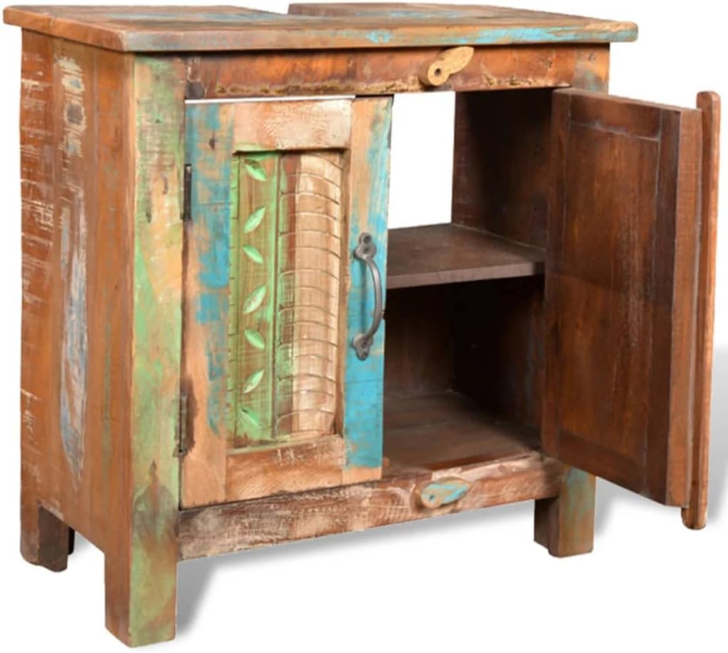 This wooden bathroom cabinet set, including an antique-style vanity cabinet and a wood-framed mirror, is an eye-catcher wherever it goes.The vanity cabinet is 23.6" high and has 2 shelves inside. It has a hole on the sturdy top surface, which is designed for your bathroom sink. The mirror with colorful patterns is rare, and it's a great addition to any bathroom.The vanity cabinet and the frame of this mirror both are made from reclaimed wood, which means that every piece of furniture is unique and slightly different from each other. The furniture made from reclaimed wood has characteristics of different wood, like teakwood, acacia, mango wood, saal wood, etc. Reclaimed wood is solid, stable, durable, and beautiful. The nail holes or clear-faced grains bring their history with them and invite another generation to permeate them witMirror specifications:Total size: 18" x 22" (W x H)Mirror size: 12" x 15" (W x H)Frame material: Reclaimed solid woodCabinet specifications:Pure handmadeWith 2 shelvesMaterial: Reclaimed solid woodTotal size: 24" x 12" x 24" (L x W x H)Hole size: 7" x 3" (L x W)With a hole for bathroom sinkMulti-color wood with iron knobsPolished, partly painted & waxedDelivery includes 1 x mirror, 1 x vanity cabinetNote: Sink is not included