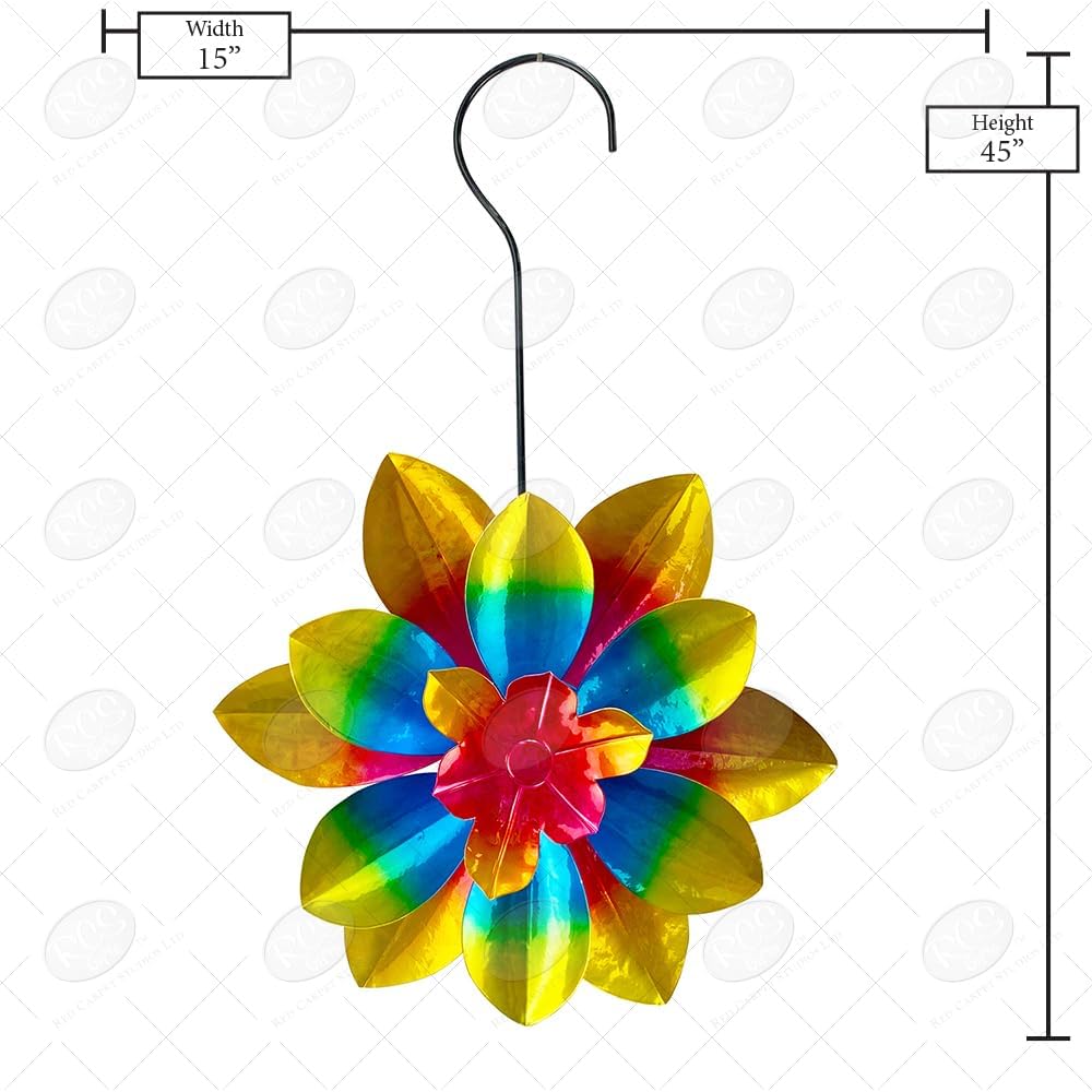 Enhance the beauty of your outdoor spaces with this metal garden spinner that can be hung or staked with the included h-base stake and hanging hook. Multi-Leaves Spinner with pink, blue and yellow leaves mesmerize as the spin and twirl in the breeze. Spinner measures 15-inches in diameter and if used with stake it stands 45-inches tall. Look for more lawn and garden art and decor from Red Carpet Studios. We explore the tranquility & allure of the outdoors, bring you birdhouses, chimes, garden stakes, & a collection of kinetic garden decor.