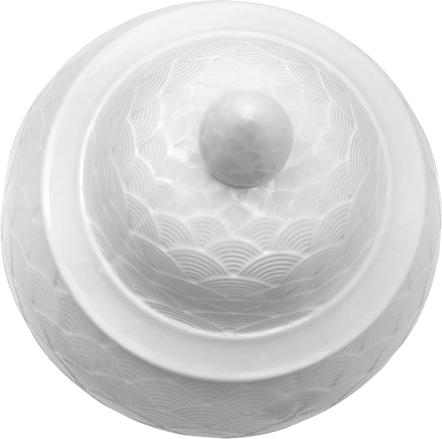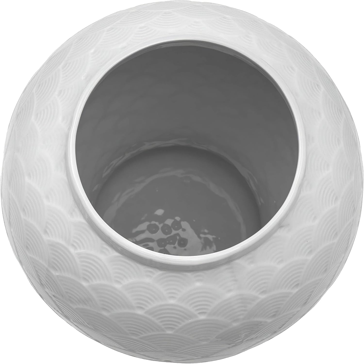 Large Oriental porcelain temple jar finished with a unique white scaled design. Display in matched pairs on a hearth, breakfront, credenza, or alone on a pedestal or plant stand. The lids are removable, great for storing collections of small objects. A wonderful accent piece to complement traditional or modern home decor styles.