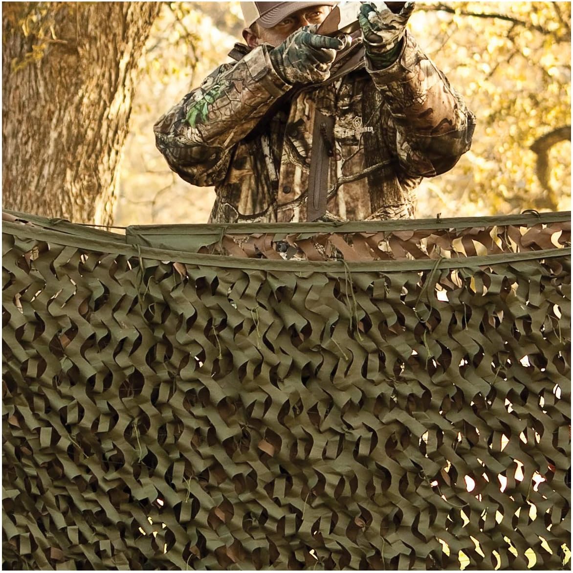 Our new Field Series and Trophy Series Big Game Camouflage Nets offer thick concealment and significant durability. The reversible matte brown and green color scheme make it ideal for all season and regions. It's constructed of a water resistant polyurethane coated material with all edges sewn. Enhanced fabric and construction allow this net to be used for season after season. The edges also feature tie straps all the way around which make hanging this net simple. The leaf-cut design gives this netting a three dimensional look with superior depth making it ideal for concealing blinds, UTVs, boats, supplies and other gear. Our Big Game Trophy Series Net boasts a thick mesh military style backing. Both net styles are available with fire retardant protection. A stuff sack is included for storing and transporting.