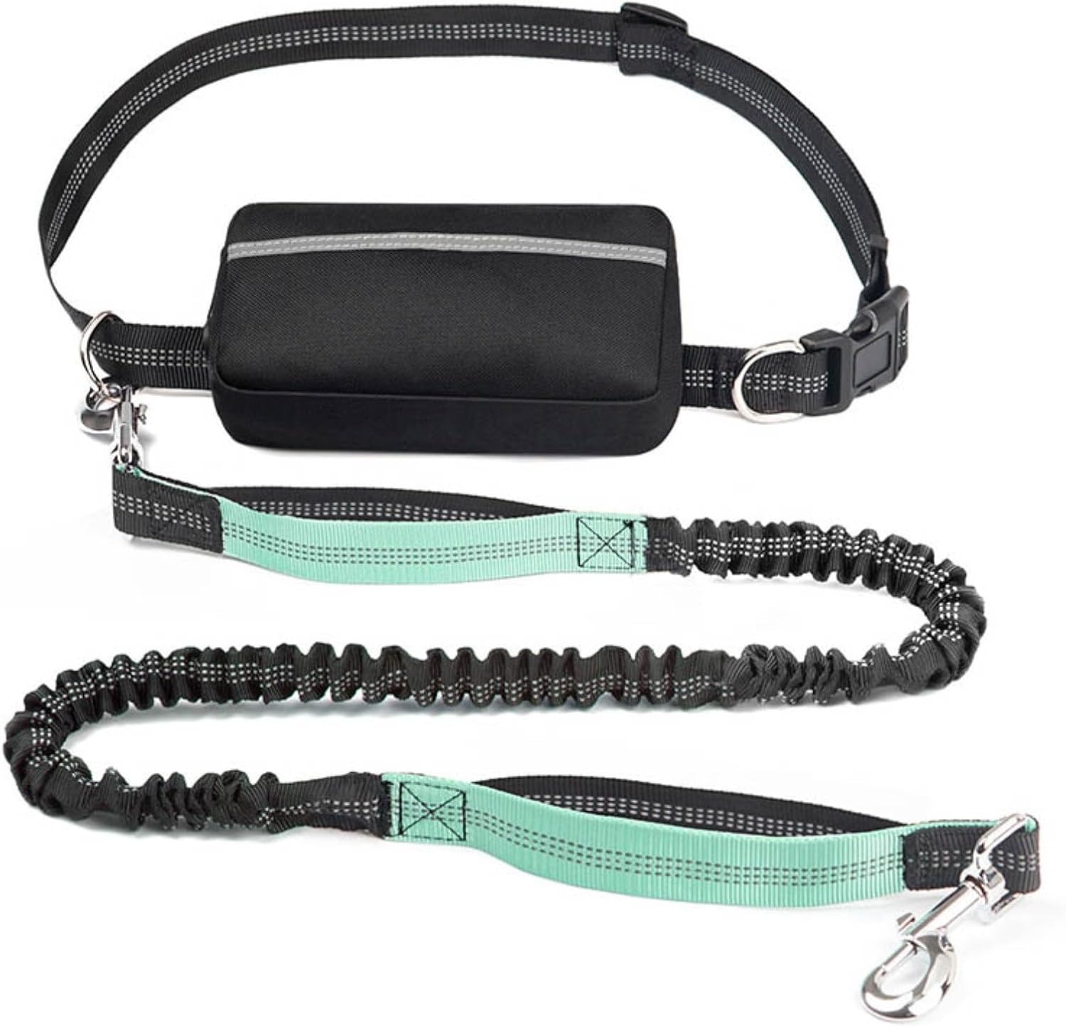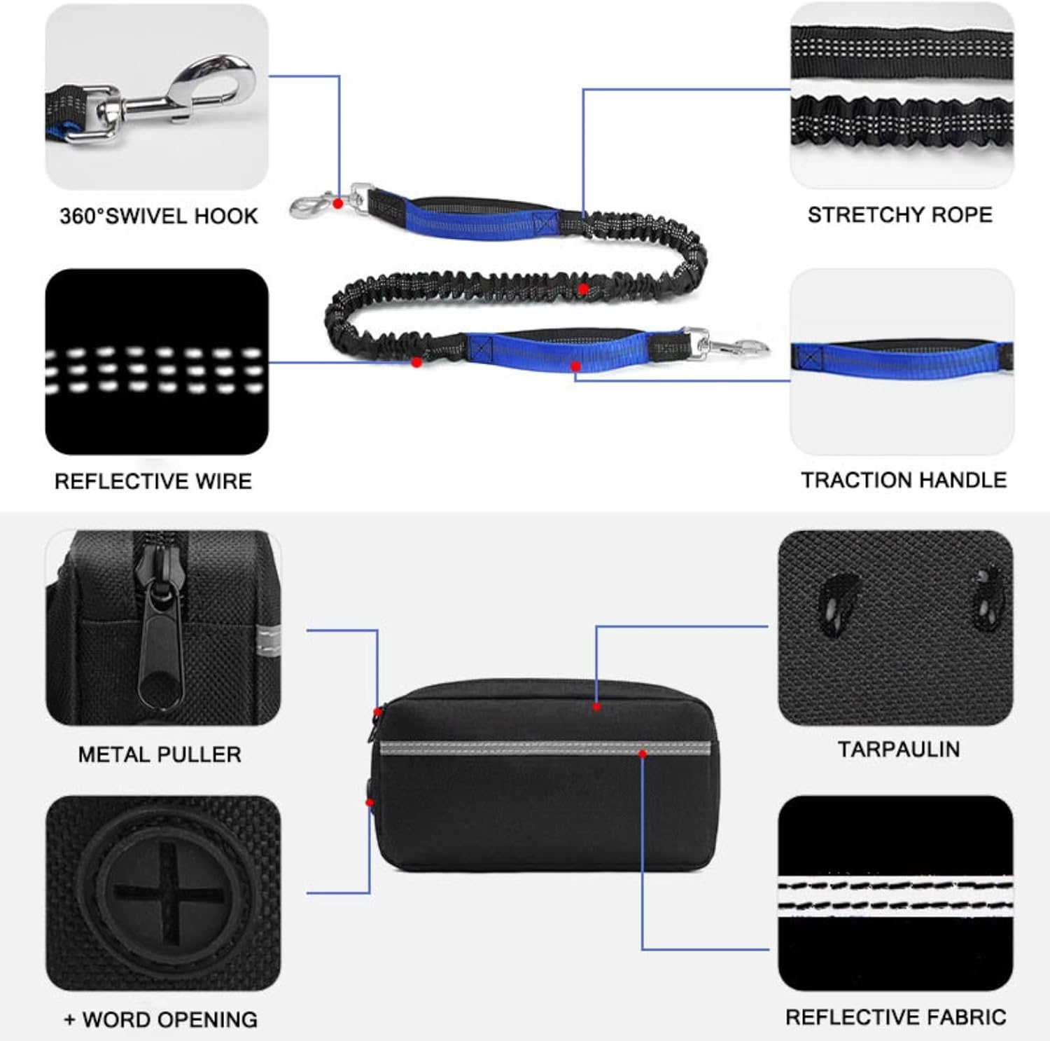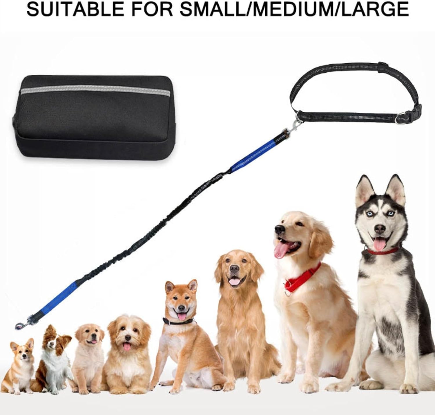 Are you tired of getting your hands busy when walking your dog? Do you feel uncomfortable to hold the leash while running? Are you suffering wrist pains caused by dog's jerks? You need hands free dog leash to get these issues solved.Product Specifications:Material: Oxford cloth, reflective wire, zinc alloy, POMSuitable for all breedsAdjustable range of leash: 120~183cmBelt adjustment range: 70.5~126.5cmWaist Pack Size: 17x8.5x3cmWebbing width: 2.5cm●Package Includes:Waist Belt X 1 PieceBungee Leash X 1 PieceZipper Pouch X 1 PieceWAIST BELTWaistband of the running dog leash has fixed D ring and movable D ring. You can attach 1 bungee leashes. The movable D ring allows dog move more freely and eliminates tangling.WAIST POUCHDog running leash also includes detachable waist pouch with poop bag hole and 2 compartments, designing for storing poop bags and necessaries such as phone, keys, cards. With hands free, you are able to do multiple tasks.SHOCK ABSORBThe hands free leash is good to correct dog's behavior. When your dog pulls, the leash tension increases and your dog will try not to pull. Bungee leash absorbs shock and jerking pull from you dog, so your waist gets less stress and won't be injured.TWO HANDLESThere are double padded handles on the both ends of bungee leash, comfortable and easy to hold. You can easily grip the near handle for emergency control. Another handle allows you to gain more secure control in busy areas.