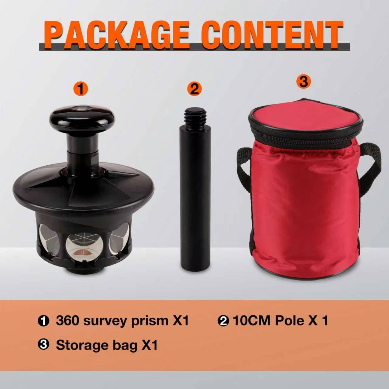 ①MULTIUSE AT DIFFERENT BRAND TOTAL STATIONS. Equipped with ⅝” x 11 mounting thread to enable quick attachment to compatible instruments, this prism is compatible with all robotic total stations including T-style, T-style, S-style,Swiss-style and more. ②ACCURATE AS BEST. It offers an offset of +2.0 millimeters and comes with a built-in, bulls-eye bubble to keep the prism level when used with a stakeout point. The new useful 360-degree prism is designed to enhance the range and accuracy of distance measuring devices. ③INCLUDED A CARRYING BAGS. The unit comes with an aluminum height adapter(100mm) and a soft carrying case for convenient transfer from working site to another.④Protective Design . The Mountlaser 360-Degree Reflective Prism with Height Adapter is durable to hold up in the most rugged conditions for years to come, which designed with a protective rubber bumper on its exterior ring. ⑤BEST PERFORMANCE PRISM COATED SILVER. The Mountlaser assembly boasts seven, 25.4mm silver-coated prisms to provide 360-degree reflection, ensuring quick tracking lock with robotic instruments.