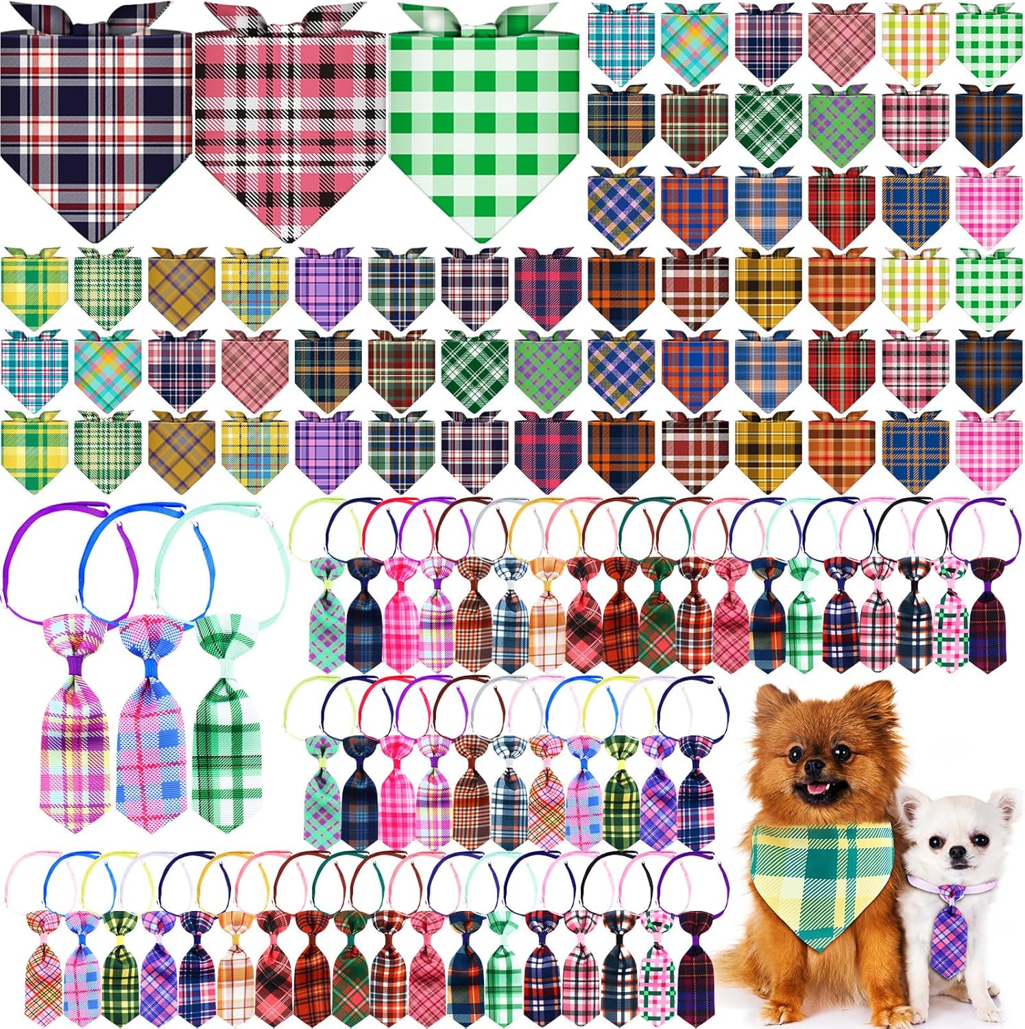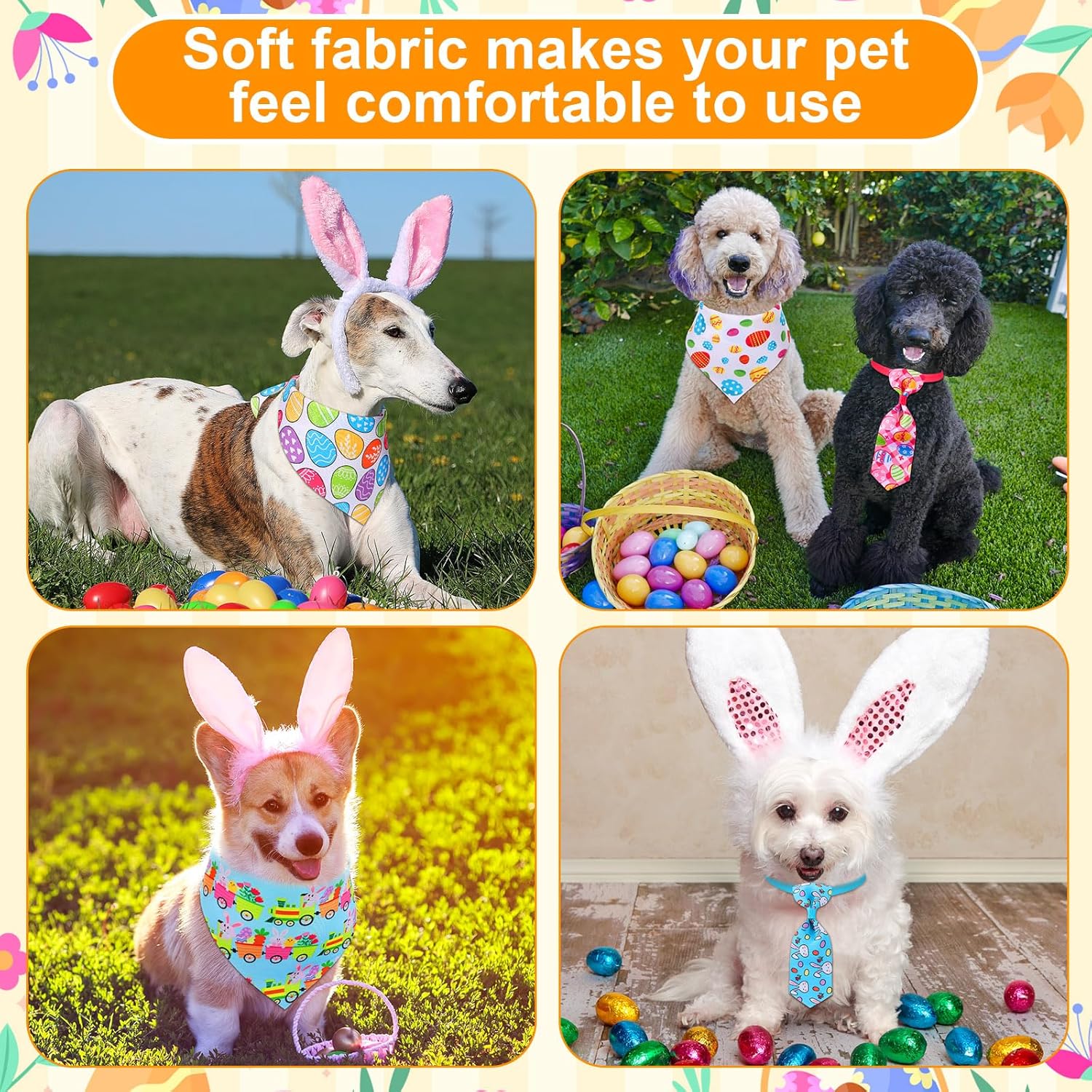 Features: Made from lightweight, safe polyester, the Easter dog pet bandanas are soft, washable, and durable. Featuring a plastic clasp, ties are easy to wear and adjust, ensuring comfort. Specifications: Main Material: polyester Main Color: colorful Size: Dog bandanas: 23.2x16.4x16.4 inches Dog neck ties: 14-35 inches Package includes: 60 x Dog bandanas 48 x Dog neck ties Notes: Manual measurement, please allow slight errors on size. The color may exist a slight difference due to different screen displays. Please measure the size before placing an order