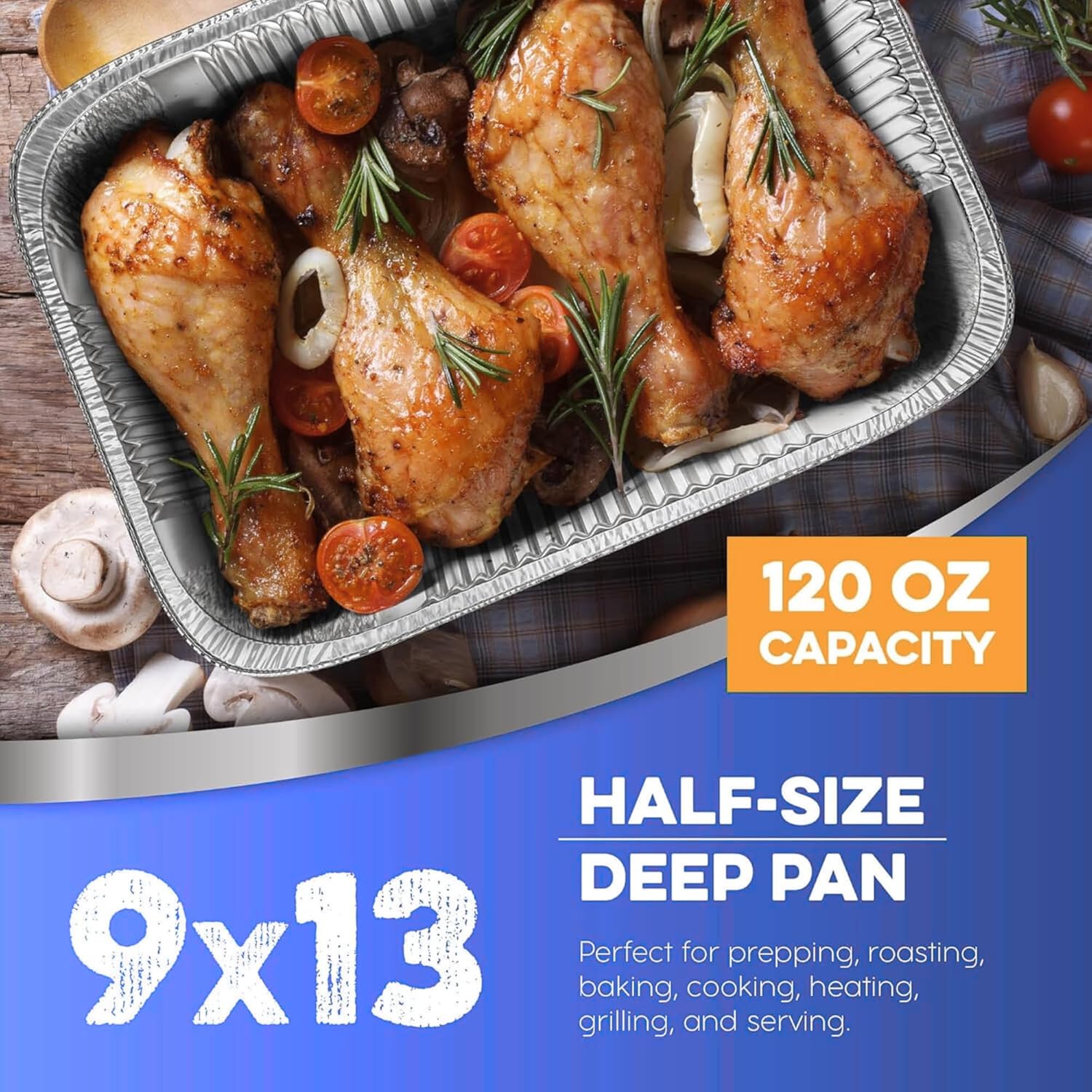 These aluminum pans 9x13 offer versatile and eco-friendly construction. With durable aluminum Along with 3 PCS of FREE SERVING UTENSILS, they handle baking, cooking, and storage needs. Whether for meal prep or professional catering, they ensure reliable performance and convenience, perfect for any kitchen.Versatile and Eco-Friendly ConstructionCrafted from durable heavyweight aluminum, these disposable aluminum foil pans are not only disposable but also environmentally friendly. Their sturdy build ensures they can withstand various culinary tasks, including baking, cooking, roasting, and broiling. Moreover, their robust design makes them suitable for deep freezing, storing meals, or conveniently refrigerating leftovers.Multi-Purpose UtilityThese disposable containers with lids offer versatility beyond the kitchen. Whether your meal prepping for the week or packing lunch for work or school, they serve as convenient lunch boxes, providing a reliable solution for transporting food. Furthermore, their adaptability extends to baking tasks, allowing you to create delectable treats like bread, cakes, meatloaf, and lasagna with ease.Reliable Performance and ConvenienceWith their durable construction and ability to handle various cooking and storage needs, these 9x13 foil pans guarantee reliable performance in any culinary scenario. Whether you're a professional chef catering a large event or a home cook preparing meals for the family, these pans offer the convenience of disposable usage while maintaining the quality and integrity of your dishes. From oven to freezer to table, they ensure hassle-free cooking and storage, making them Perfect to kitchen arsenal.