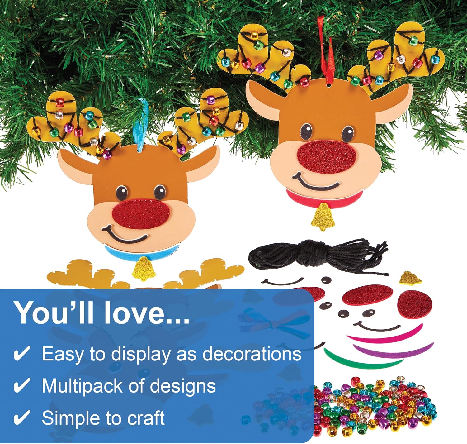 | Included Components | Each kit includes card reindeer template, self-adhesive foam pieces, wool, coloured beads & ribbon for hanging |