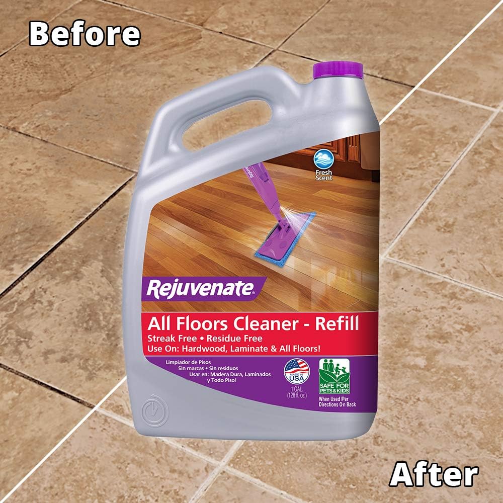 Rejuvenate All Floors Restorer and Polish Fills in Scratches Protects & Restores Shine No Sanding Required (128 oz)Polymer-based floor finish fills in scratches, and restores shine and luster to all floors making them look new again. Protects against stains and UV rays that cause fading. Increases traction by 50%.Rejuvenate High Performance All-Floors and Hardwood No Bucket Needed Floor Cleaner Powerful PH Balanced Shine with Shine Booster Technology Low VOC Best in Class Products 128ozRejuvenate No-Bucket Floor Cleaner Fresh Scent, 1 Gallon