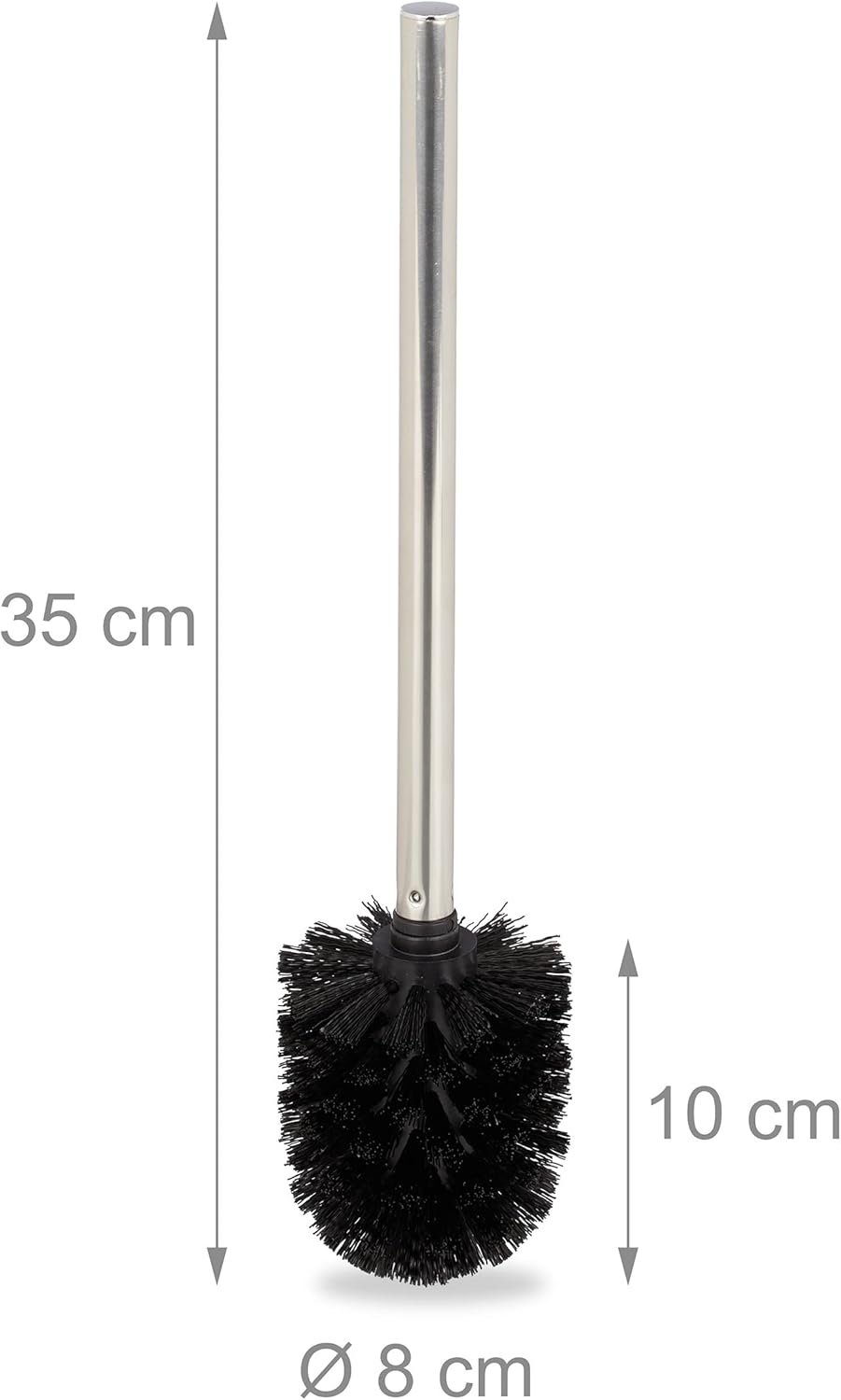 A toilet brush is essential for a clean toilet. For hygienic reasons the brush head needs to be changed regularly. This set of 2 toilet brushes is simple and practical: exactly what you need to keep your bathroom clean. The robust bristles ensure efficient cleaning and then long stainless steel handle means you can get even those hard to reach places. The head is removable so it can be easily replaced with one of the 4 spare heads. Thanks to its uncomplicated form, the brush can fit any standard holder.Set of 2 Toilet Brushes in Detail- Dimensions H x diam.: approx. 35 x 8 cm- Brush head H x diam.: approx. 10 x 8 cm- Head thread inner size: approx. 1.2 cm- Handle H x diam.: approx. 25 x 1.5 cm- Weight: approx. 70 g- Material: Plastic, stainless steel- Colour: Black, silverReplacement Toilet Brush- Practical set of 2 to replace old toilet brushes or use as spares- For a hygienic and clean toilet in the bathroom or guest toilet- Elegant design with black brush head and silver metal handle- The head is removable so it can be easily changed if necessary- 4 spare brush heads are included- Toilet brush fits and standard sized toilet brush holdersIncluded in Delivery- 2 x toilet brush- 4 x replacement brush heads- Decorative items are not included in delivery