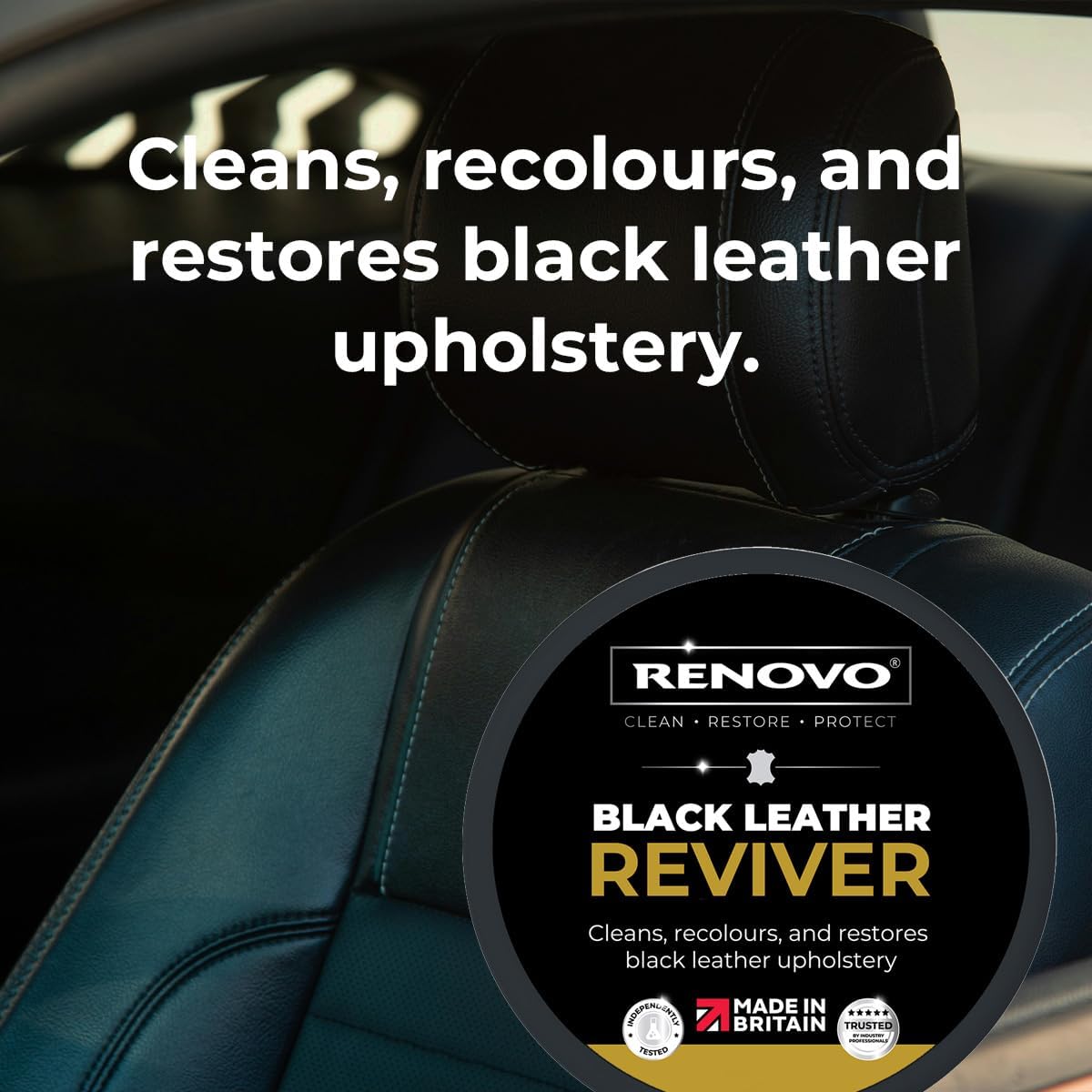 Not only does old, tired, and faded leather ruin overall the look of your car, it negatively affects it's re-sale value too; while well maintained leather upholstery is a significant plus.Cleaning, and reviving the colour of black leather upholstery can do a lot to improve the overall look of your car's interior, and Renovo's Leather Reviver is perfect for the job.Renovo's new, unique and marvellous formulation not only cleans and re-colours black leather seats, it also protects with advanced anti-bacterial guard, is effective against super-bugs, and contains a UV inhibitor too.Renovo Leather Reviver is simple to apply, gives unbelievable results, and infuses your car with that new leather scent!