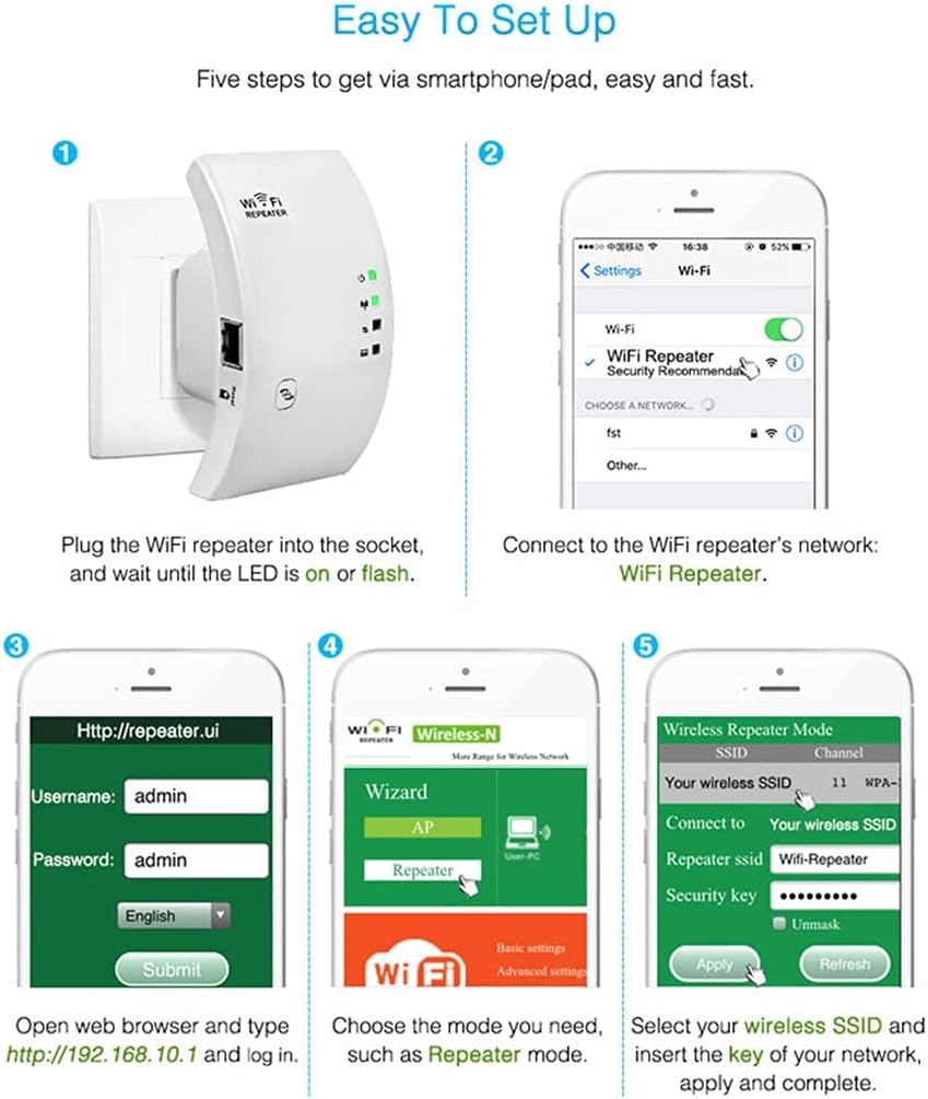 Improve coverage in all WLAN networks.Access to the Internet for computers located on the edge or outside of the range of your access point.Support 2.4 GHz WLAN networks.Provides up to 300Mbps transmission rates.Maximum WLAN security with WPA2, WPA and WEP (128/64).Software wizard for simple setup.Complies with IEEE 802.11n, IEEE 802.11g, IEEE 802.11b standards .2dBi antennas integrated.Support Repeater Mode and Standard AP Mode.Provides 10/100Mbps Auto-Negotiation Ethernet LAN .correct the language and the stablility of signal.revise default reboot.former version need reticle to reboot,but now do not need.The 2 version can support Chinese,EnglishSpecification:Product Type: RepeaterColor: WhiteVoltage: AC 110-240VFrequency Range: 2.41-2.48GHzNetworking Cable Length: Approx. 1mPackage list1x Repeater1x RJ-45 Networking Cable1x Installation GuideNotes: 1. Only sell main products, not other products.2. Since manual measurement is required, please leave a space of 1-3 cm.3. Due to screen differences, the color may be slightly different from your expected color, please allow.Remind:After receiving the packaging, please check the packaging and the product carefully. If the received item is defective or has any questions, please contact us via email to resolve the problem. We will reply as soon as possible and do our best to meet your needs!