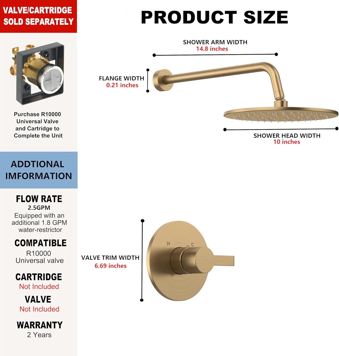 | Included Components | 10 inch shower head, shower arm with flange, shower trim with handle, sleeve |