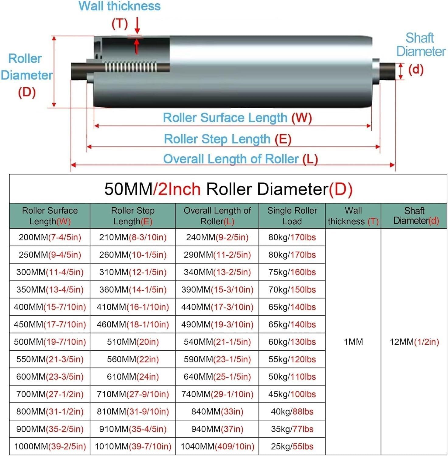 ● Specification: 1. Material: Stainless Steel 2. Roller Diameter: 50mm/2inch 3. Roller Shaft Diameter: 12mm/0.5inch 4. Roller Surface Length(W): 20cm100cm/7.839.4in 5. Roller Step Length(E): 21cm101cm/ 8.239.7in 6. Overall Length of Roller(L): 24-104cm 7. Wall Thickness: 1mm/ 0.04inch 8. Maximum Load Capacity: 80kg/ 170lbs 9. Shaft With Spring Loaded Telescoping End ● Features: 1. Uiltin bearings spring pressin installation method. 2. These rollers are easy to install with a quick and simple slotin design. 3. These conveyor rollers are ideal as replacement rollers for existing conveyor belt system. 4. Constructed of a stainless steel surface and galvanized end caps rustresistant waterproof smooth. 5. These rollers operate quietly and produce minimal vibrations ensuring smooth and efficient operation. 6. The conveyor rollers are compatible with a wide range of conveyor systems making them a versatile option for businesses. 7. conveyor rollers are longer and withstand wear and tear reducing the need for frequent replacements. 8. A goto choice for both permanent and temporary conveyor lines in warehouses shipping departments and assembly areas. ● Package Contents: 5 PCS x Conveyor Rollers ● Notice : The product size is purely manual measurement and there is an error of 13cm. It is a normal phenomenon. Please be reminded that due to the light and screen difference the item's color may be slightly different from the pictures.
